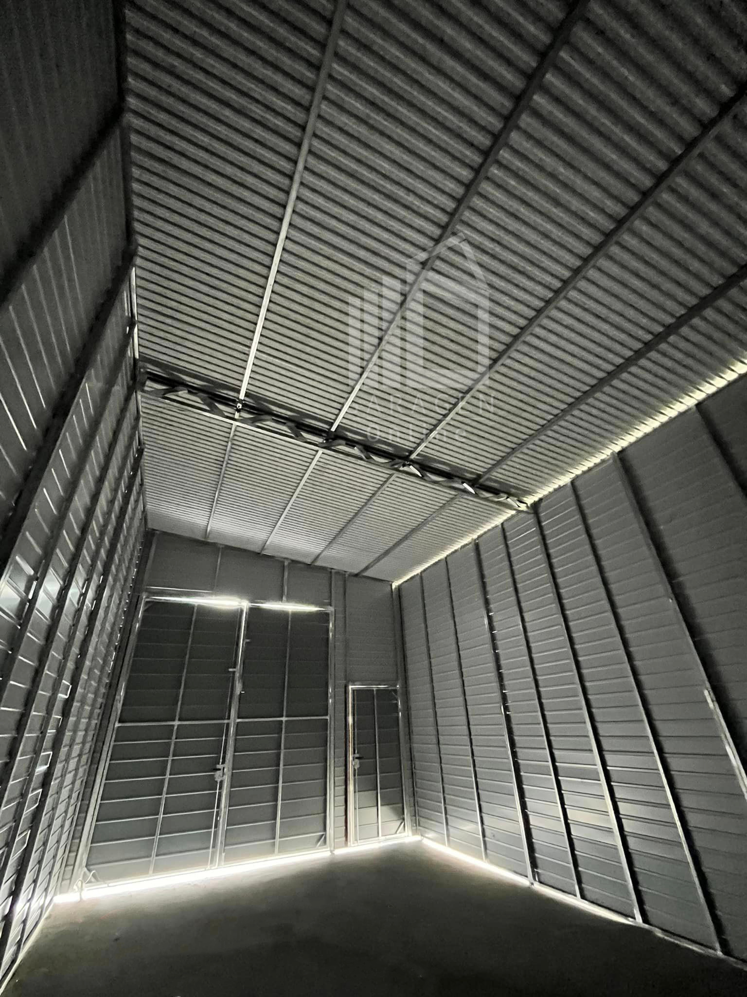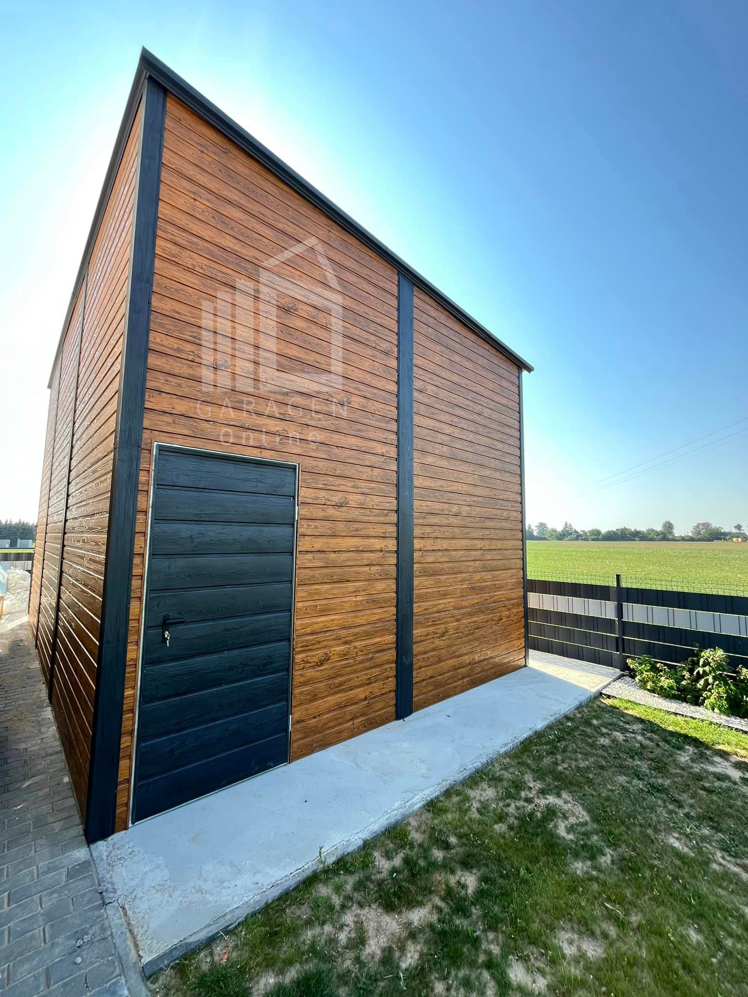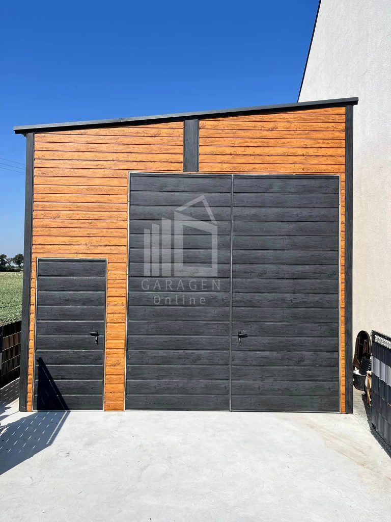 Blechgarage – Halle – 4x8m – Zweiflügeliges Tor – 2x Tür – Anthrazit – Helles Walnussholz – Holzoptik – Dach mit seitlichem Gefälle | ID706 |