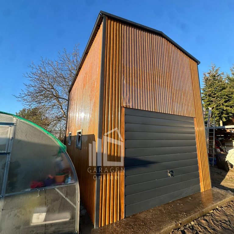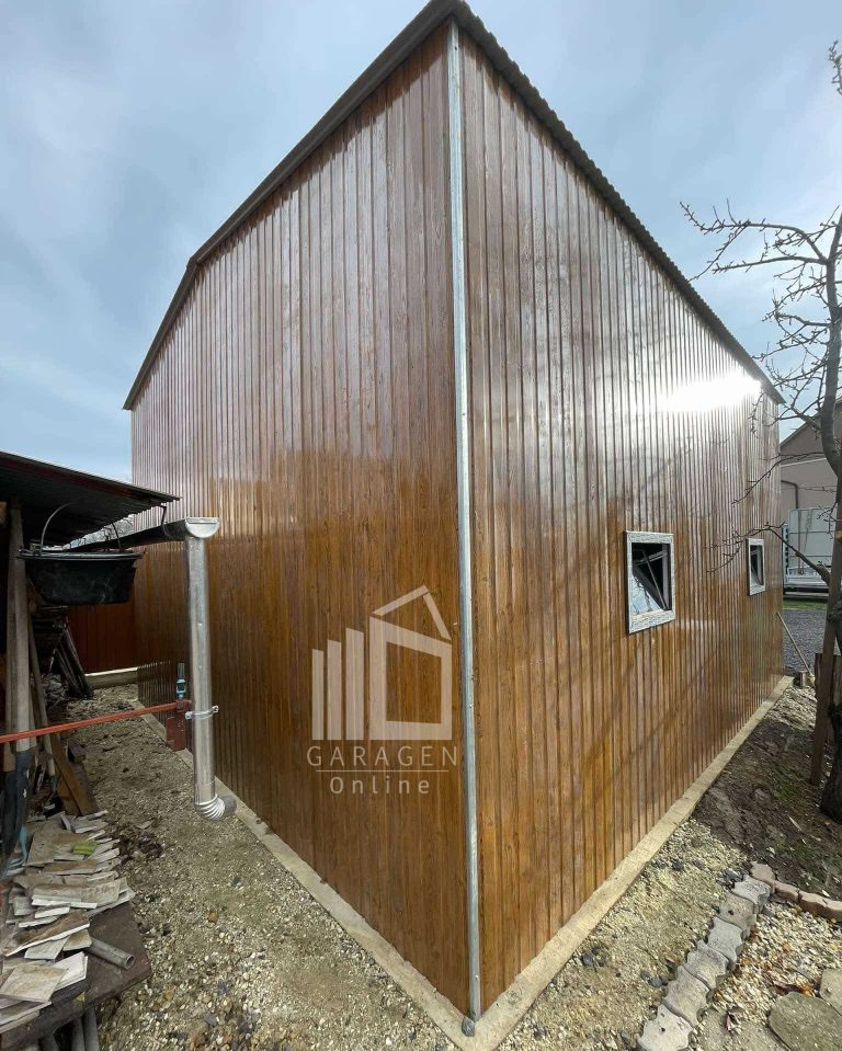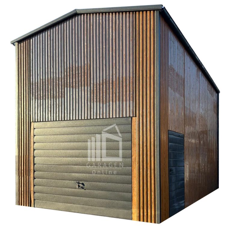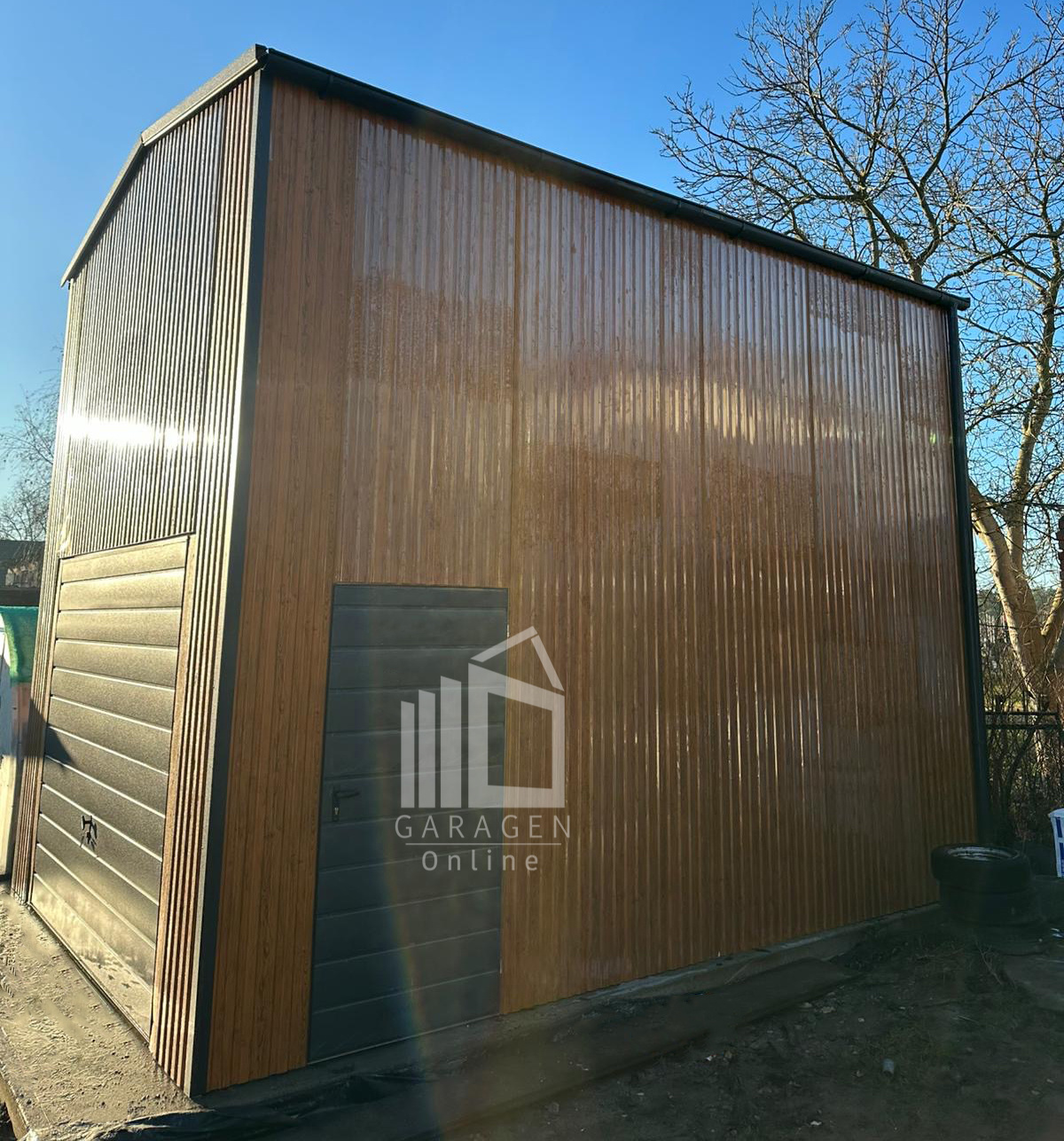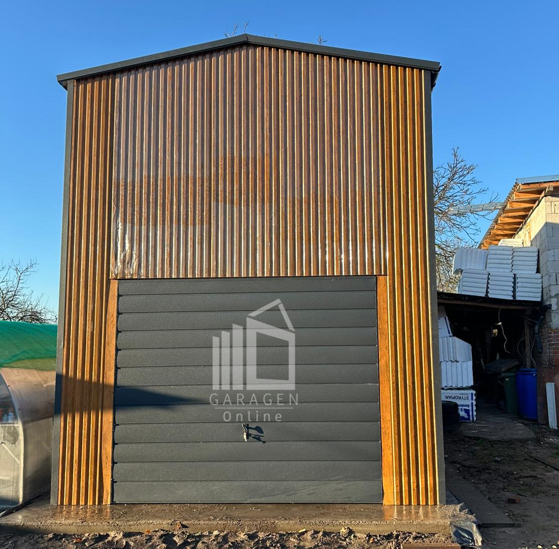Blechhalle 5x6m – Schwingtor – Tür – Holzoptik – Anthrazit – Dachrinnen – Satteldach ID937