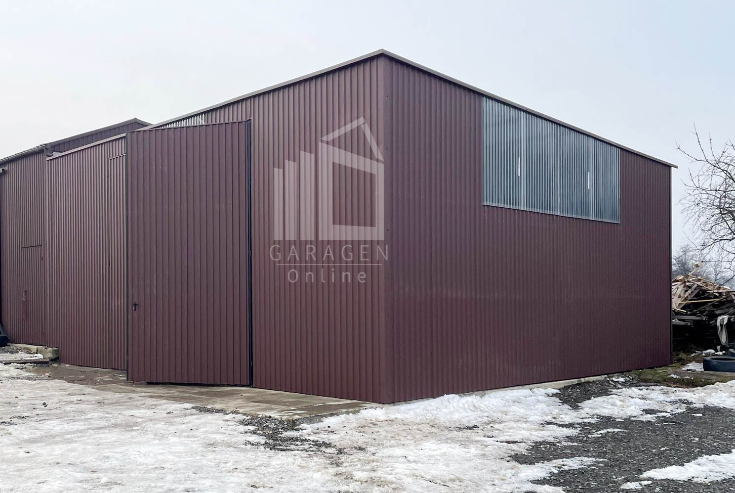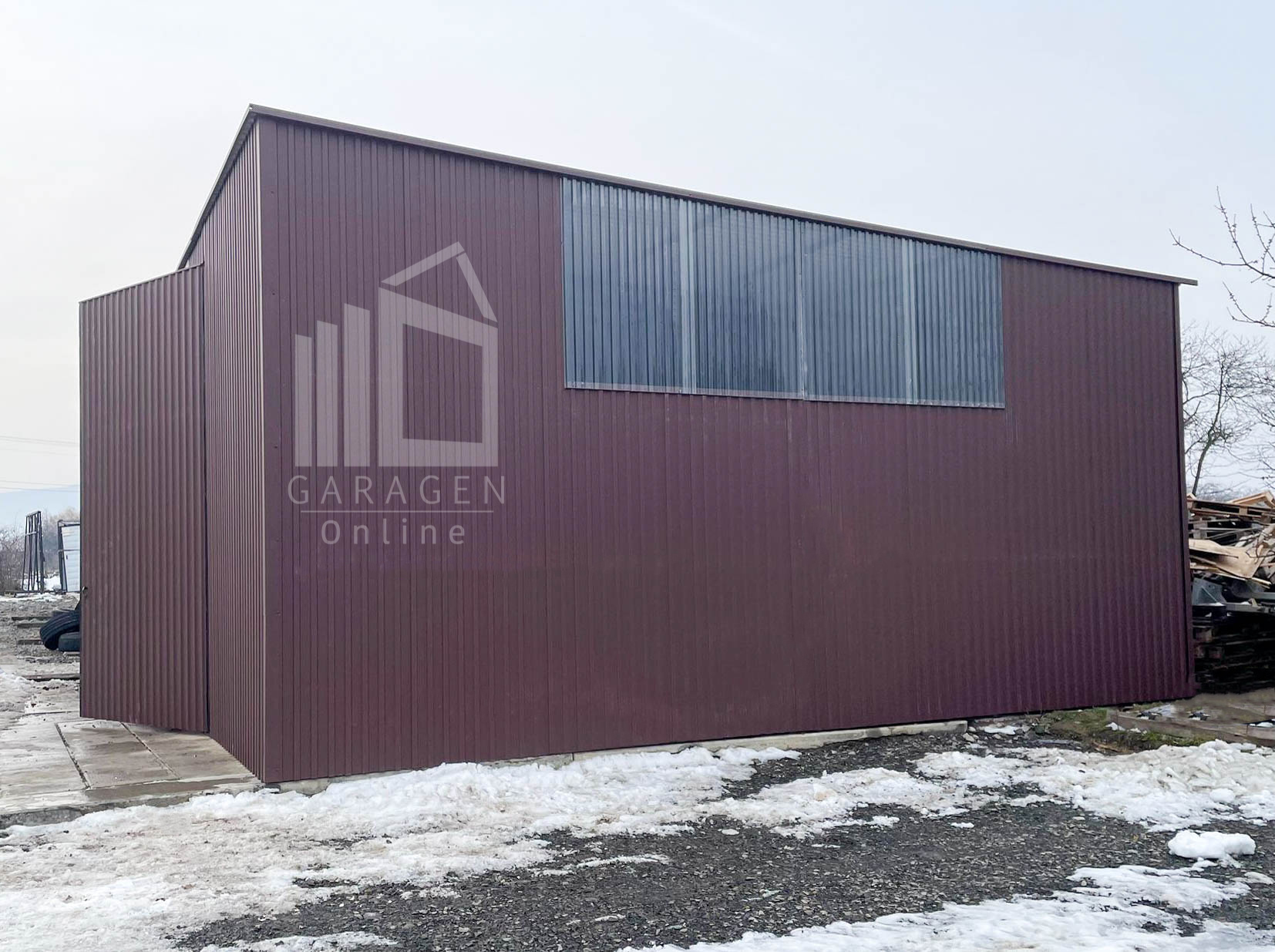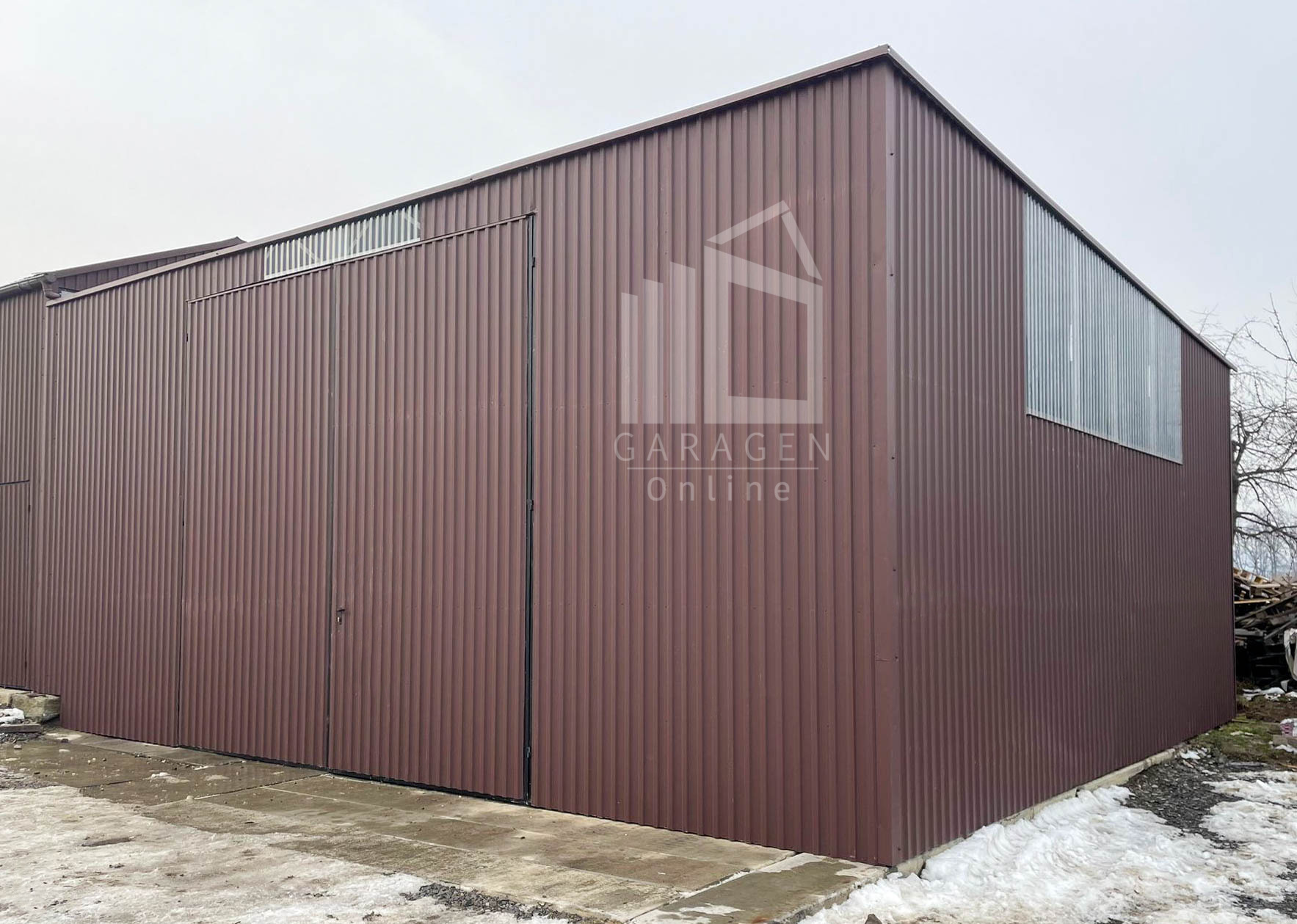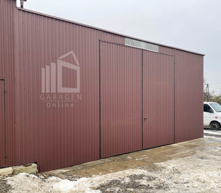 Blechhalle – Lager 9x8m Zweiflügeliges Tor – dunkelbraun – Flachdach GP587