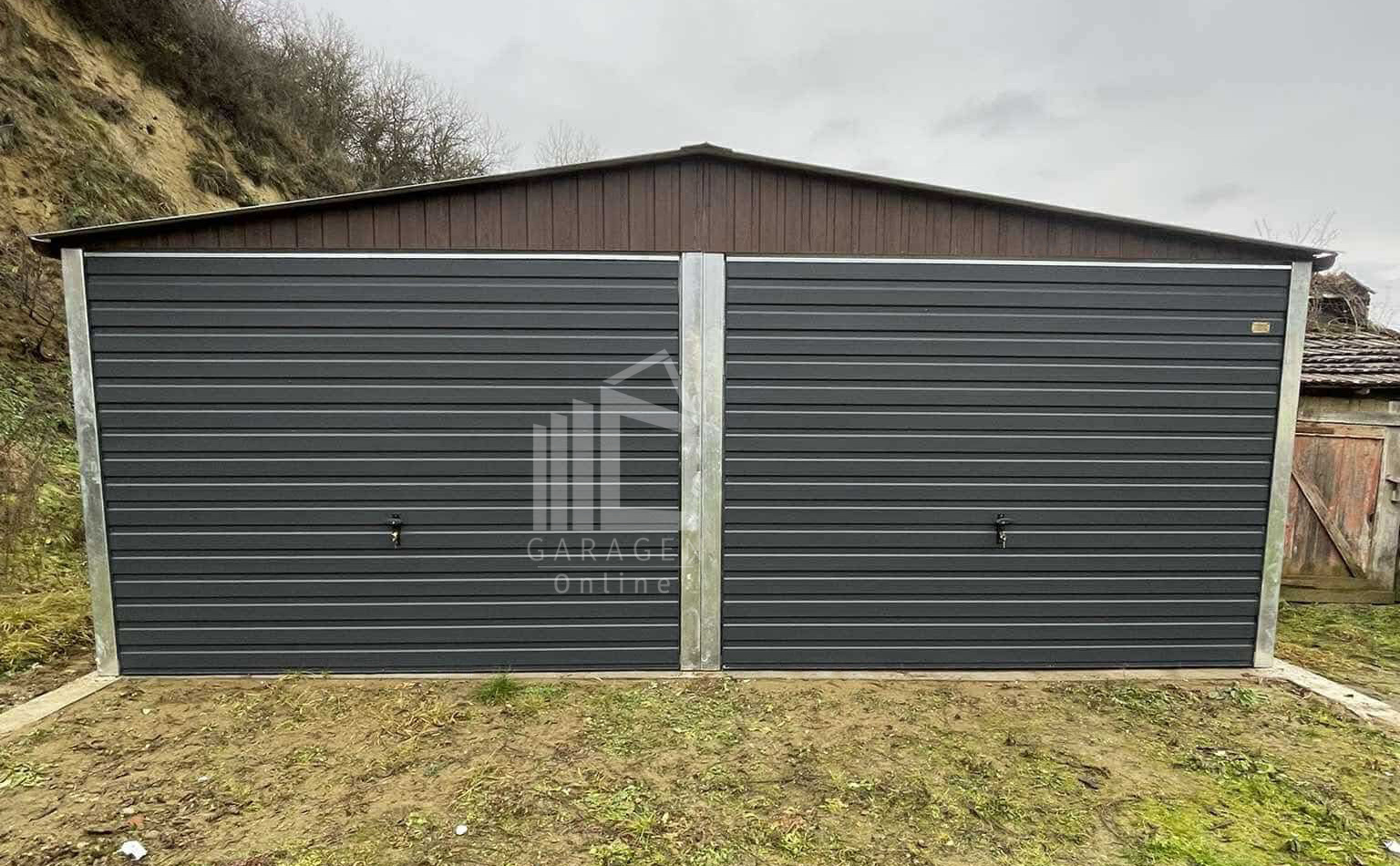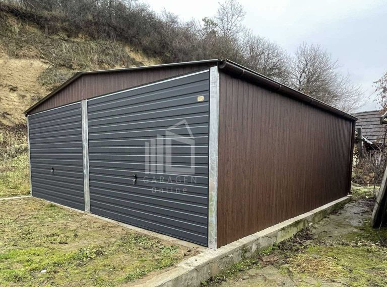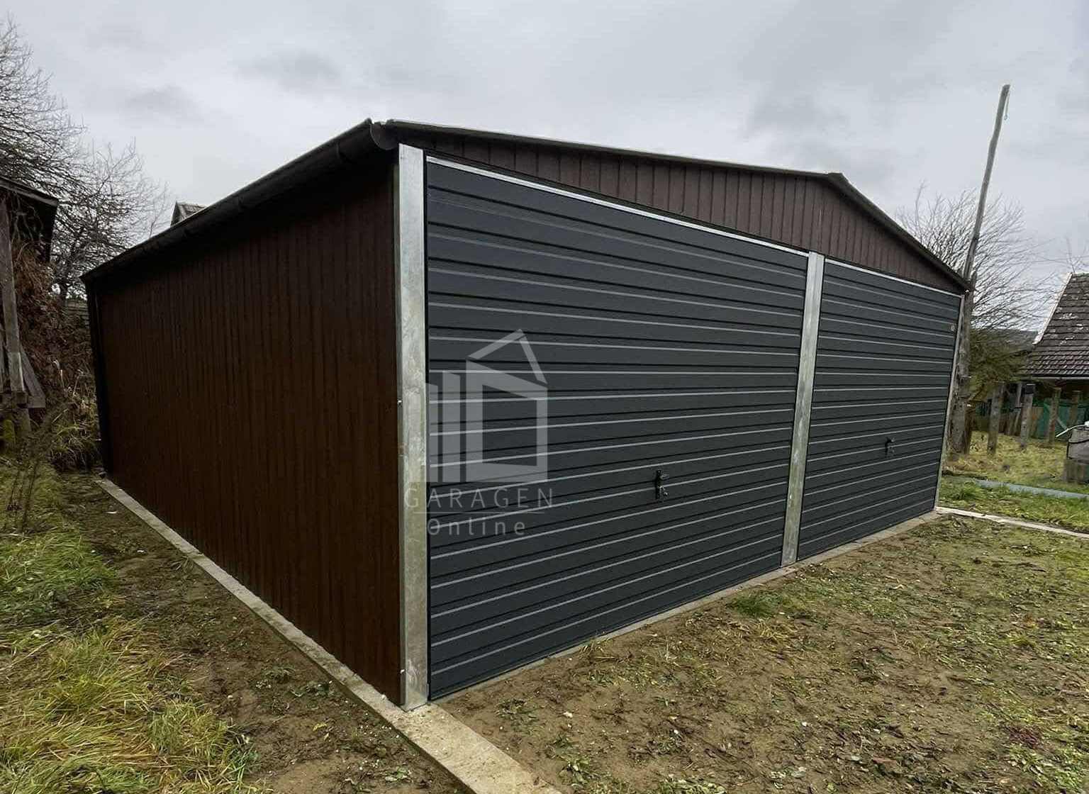 Blechgarage 6x6m – 2x Schwingtor – Dunkles Walnussholz – Holzoptik – Dachrinnen – Satteldach ID926