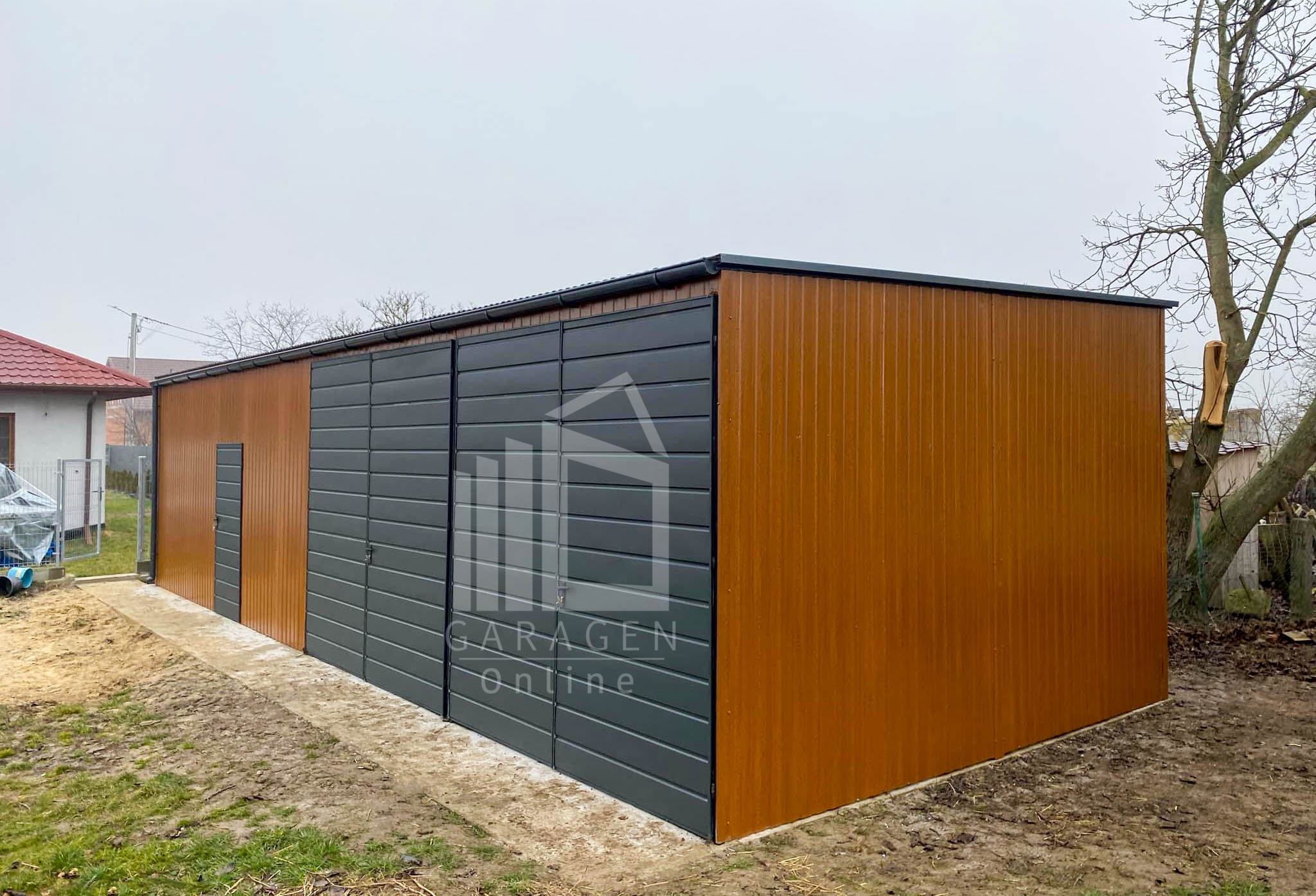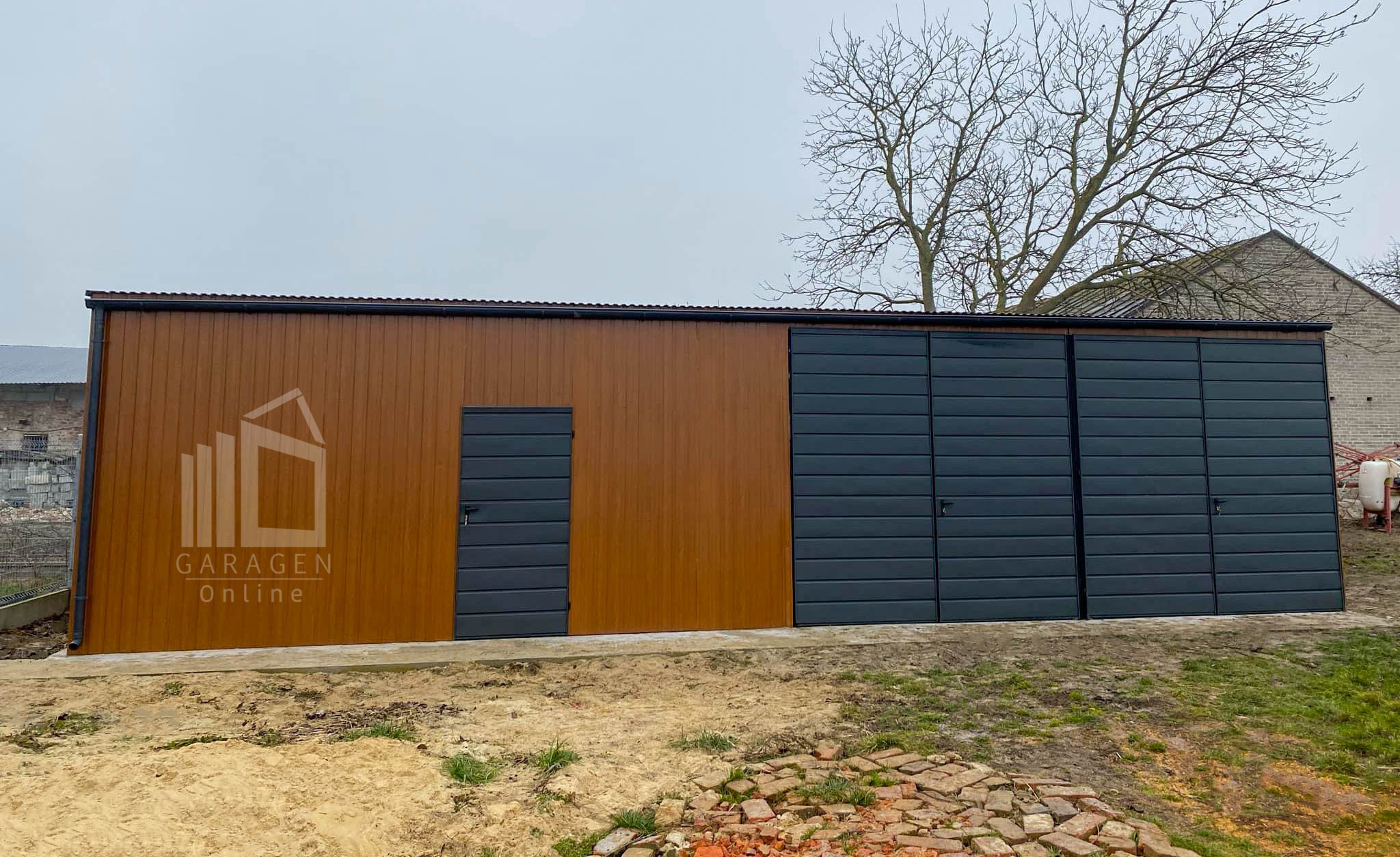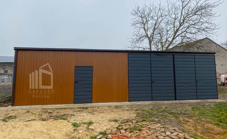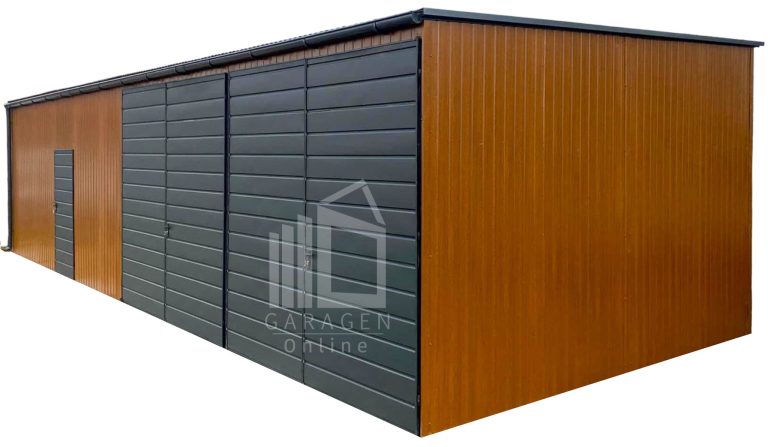 Blechgarage 12x6m – 2x Schwingtor – Tür – Anthrazit – Dachrinnen – Dach neigt sich nach vorne GP611