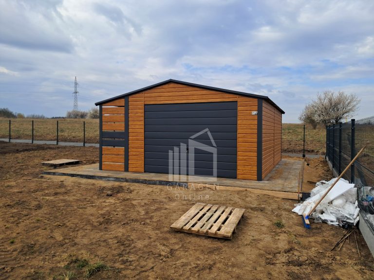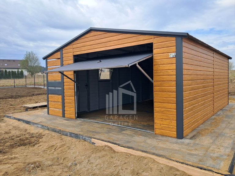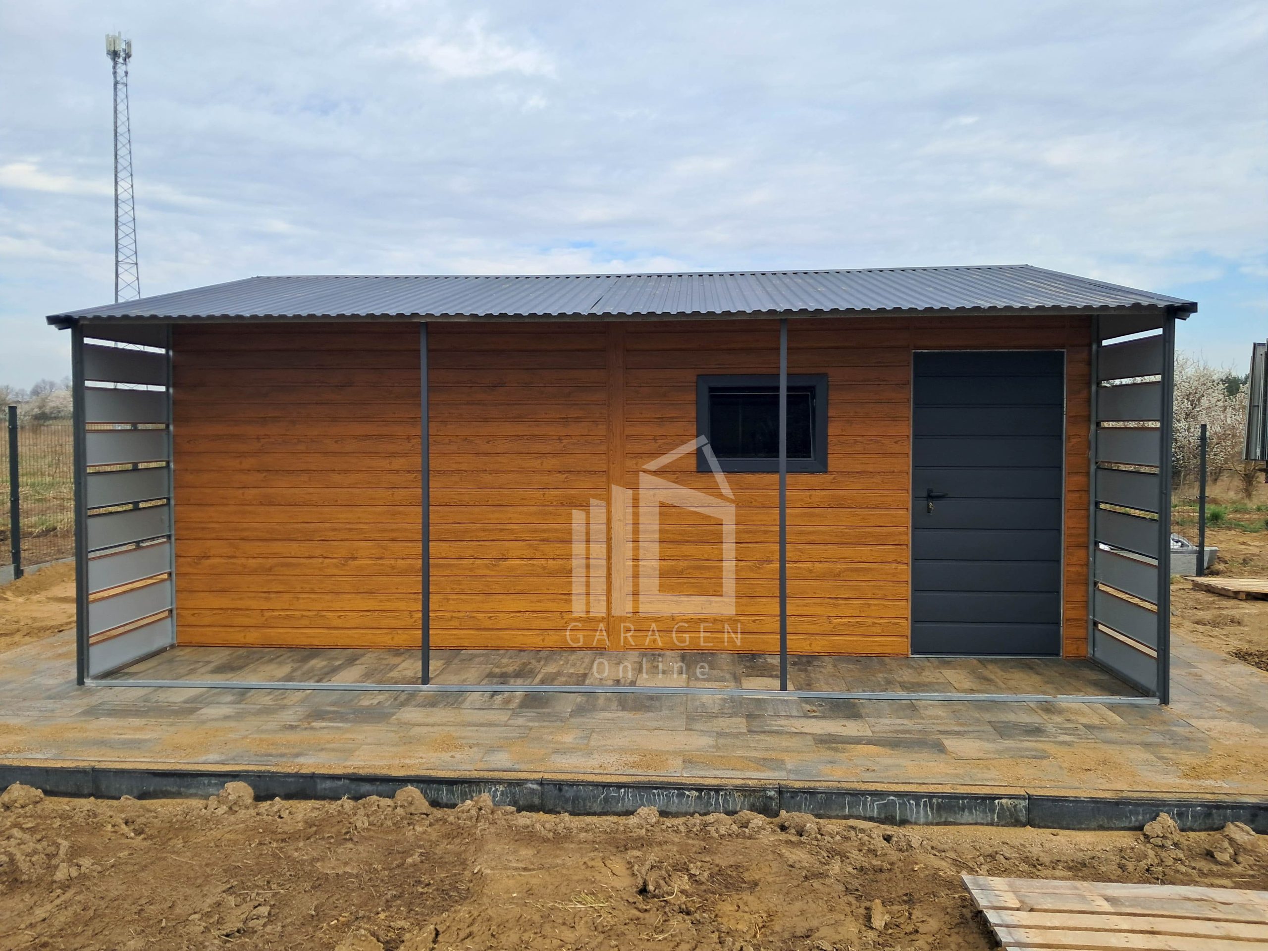 Blechgarage 4x5m + Überdachung 1m – Tür – PVC Kippfenster – Holzoptik – Anthrazit – Satteldach ID988