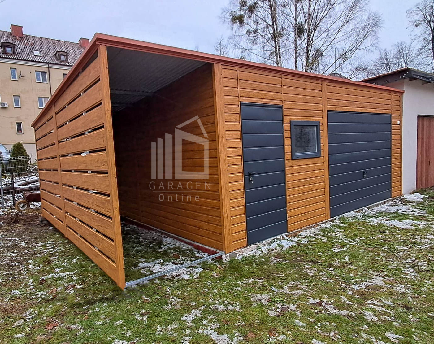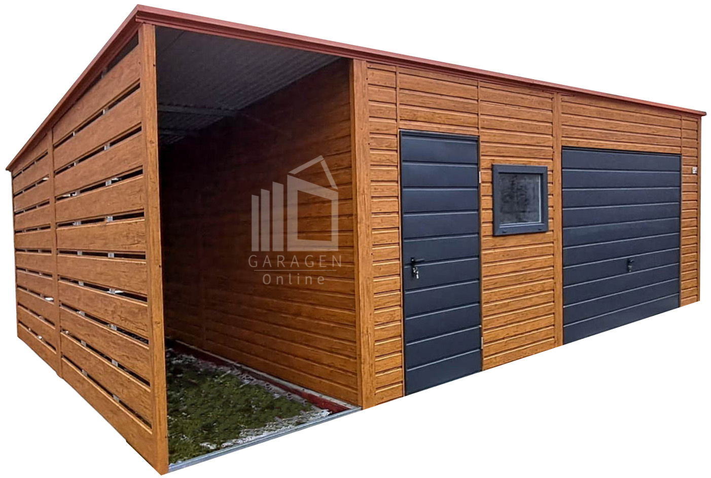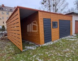 Blechgarage 6x6m + Überdachung 1,5m – Schwingtor – Tür – PVC Kippfenster – Holzoptik – Anthrazit – Flachdach ID968