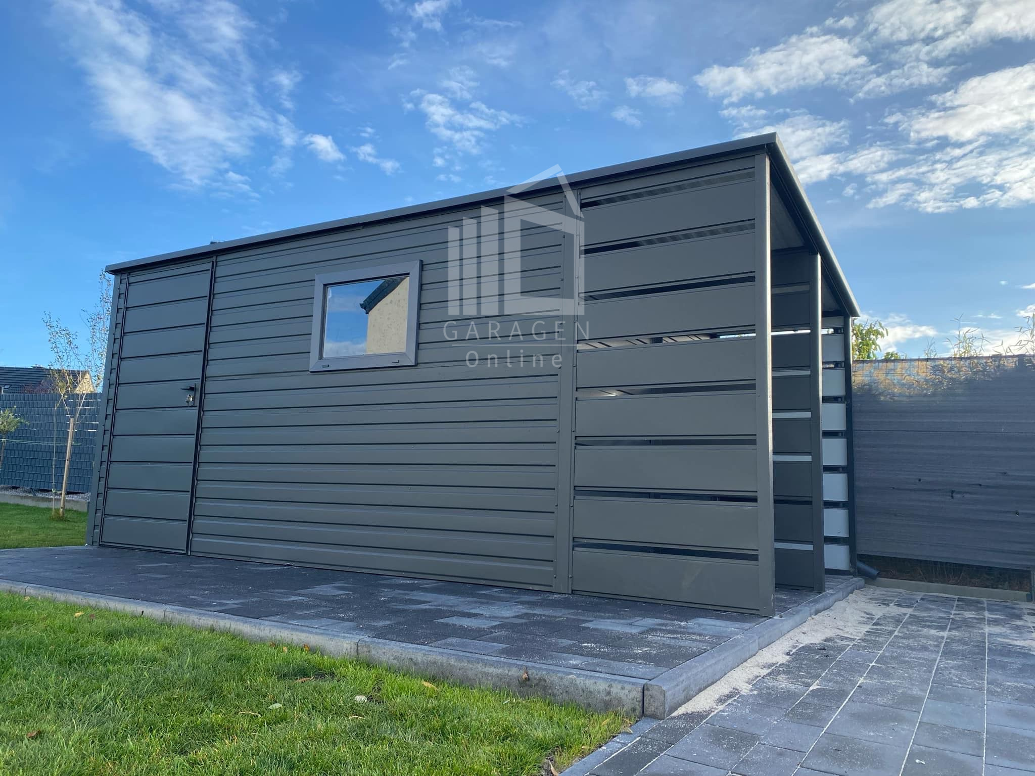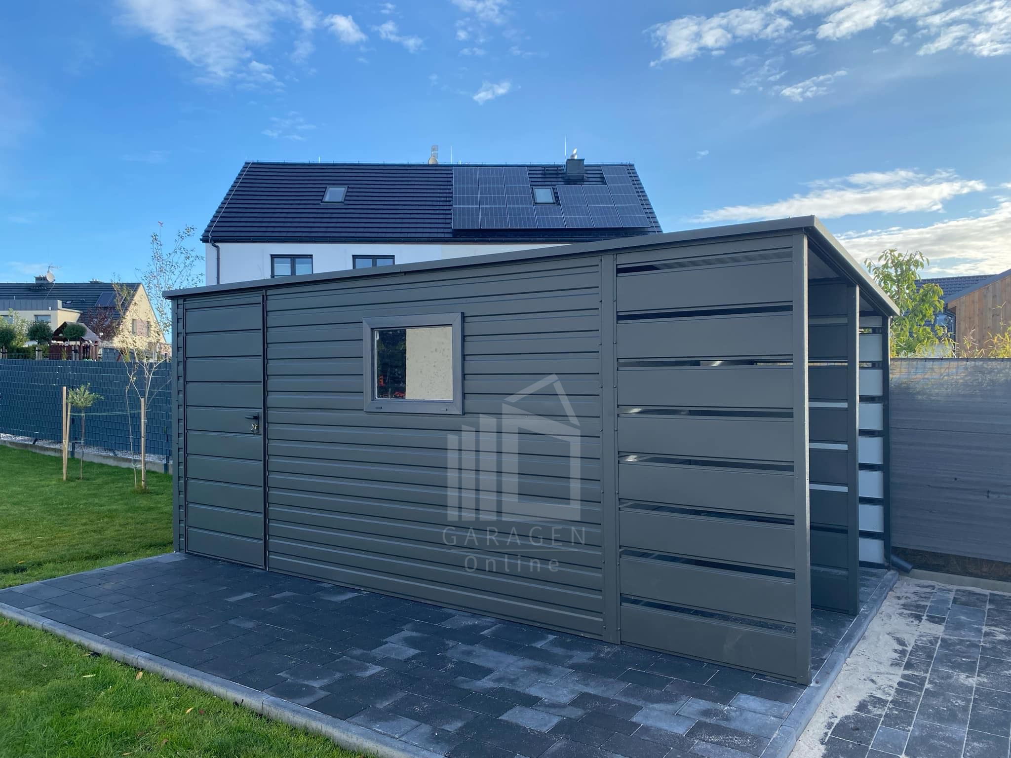Gartenhaus – Gartenschuppen 3,8×2,5m + Überdachung 1,2m – Tür – PVC Kippfenster – Anthrazit – Flachdach GP459