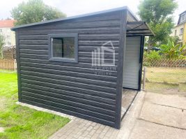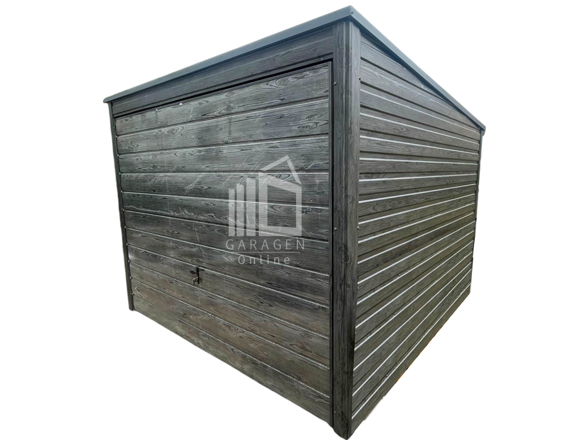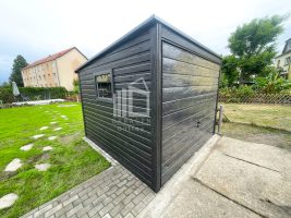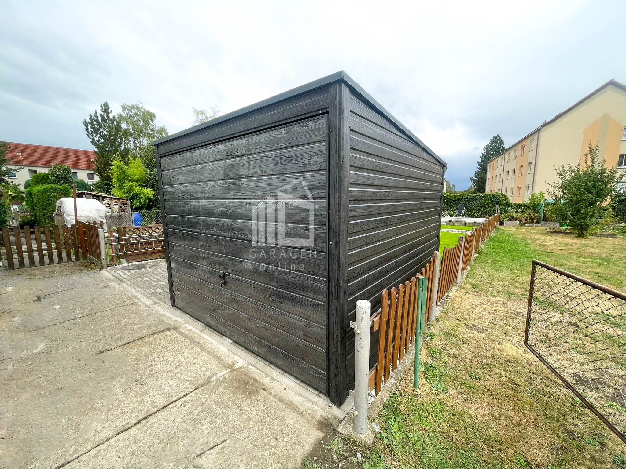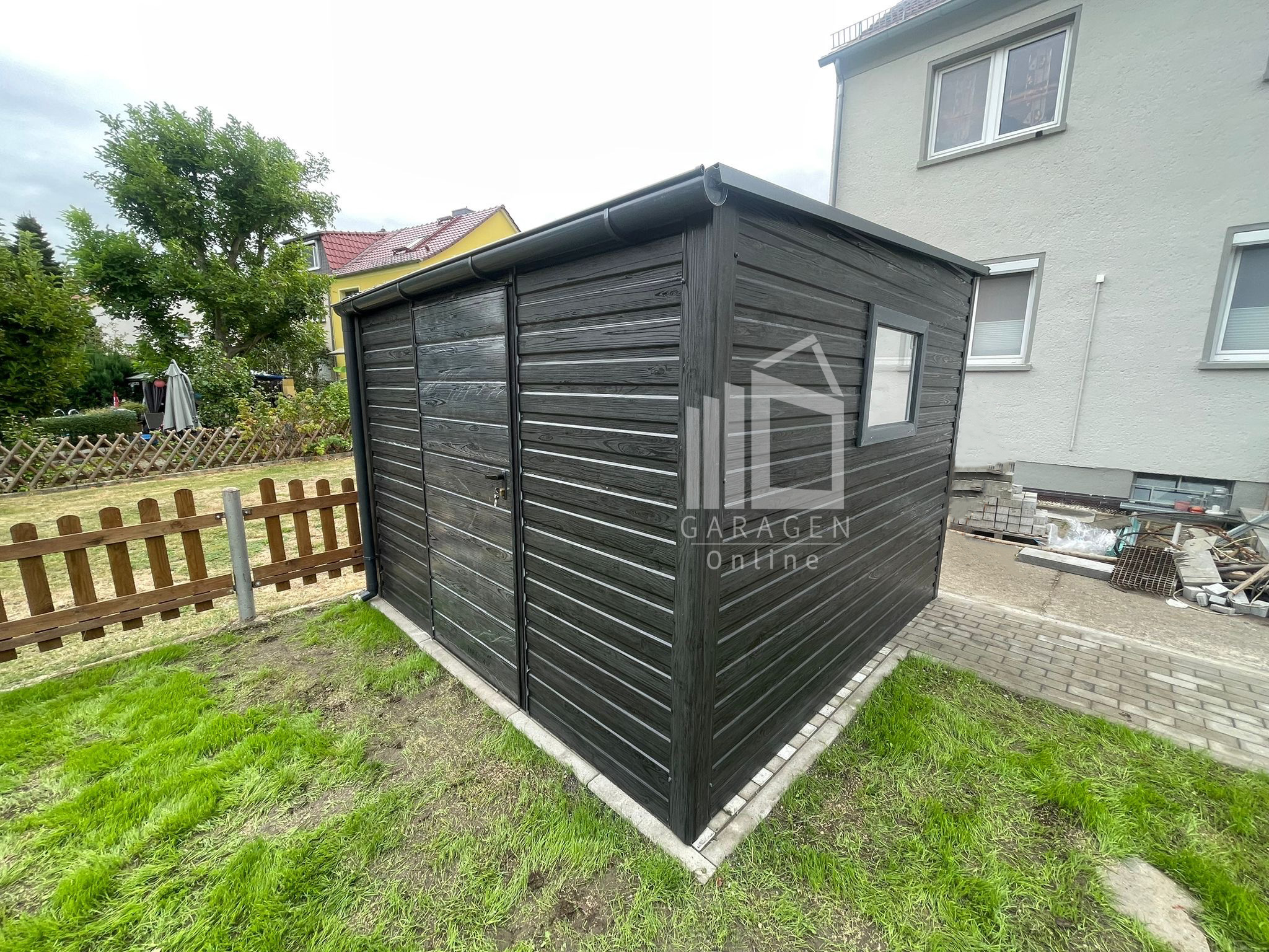 Gartenhaus – Gartenschuppen 3×3,5m Schwingtor – Tür – PVC Kippfenster – Holzoptik – Dachrinnen – Flachdach GP486
