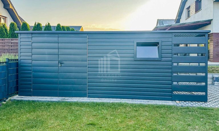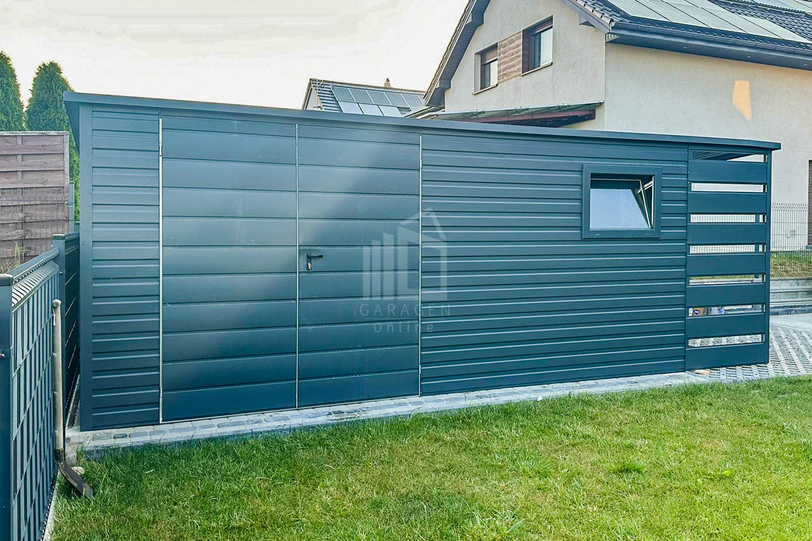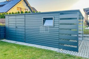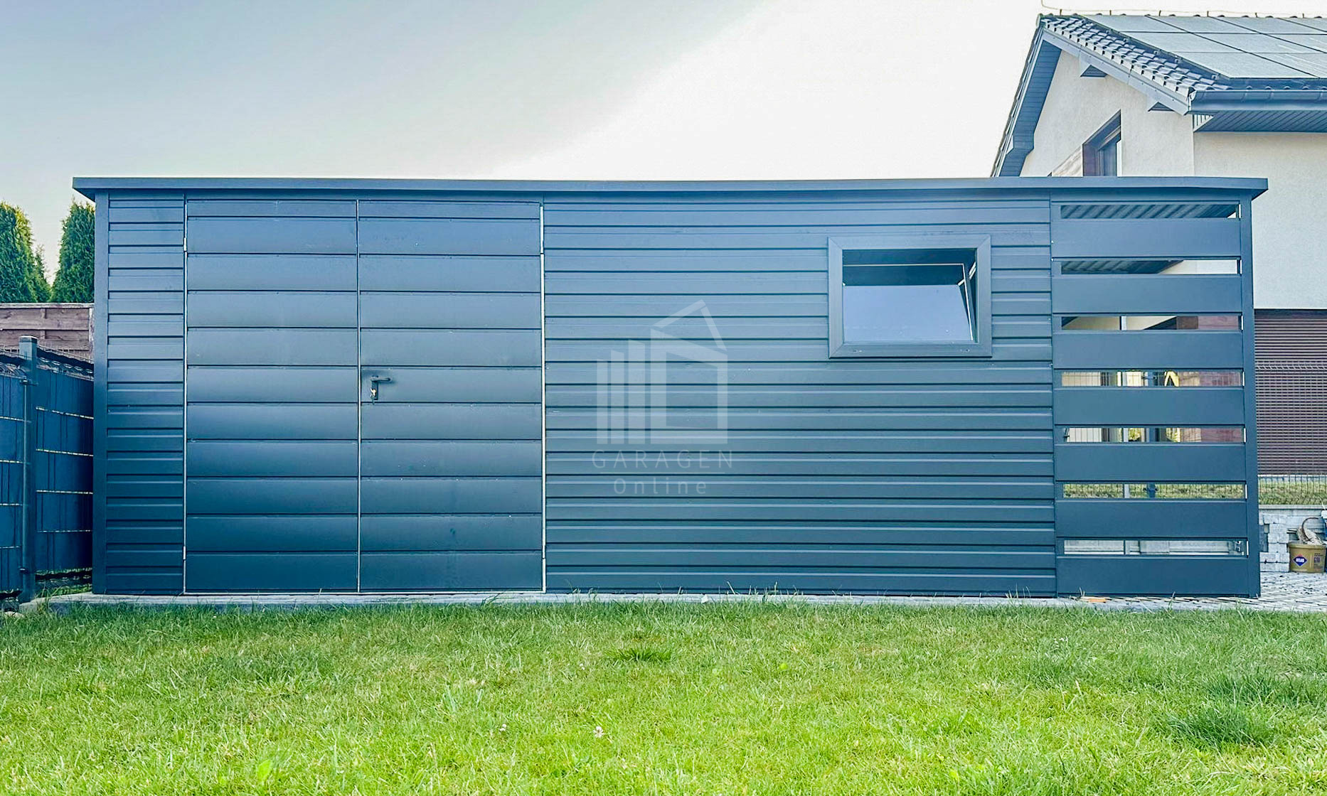 Gartenhaus – Gartenschuppen 4,5x2m + Überdachung 1m – Zweiflügeliges Tor – PVC Kippfenster – Anthrazit – Flachdach ID617