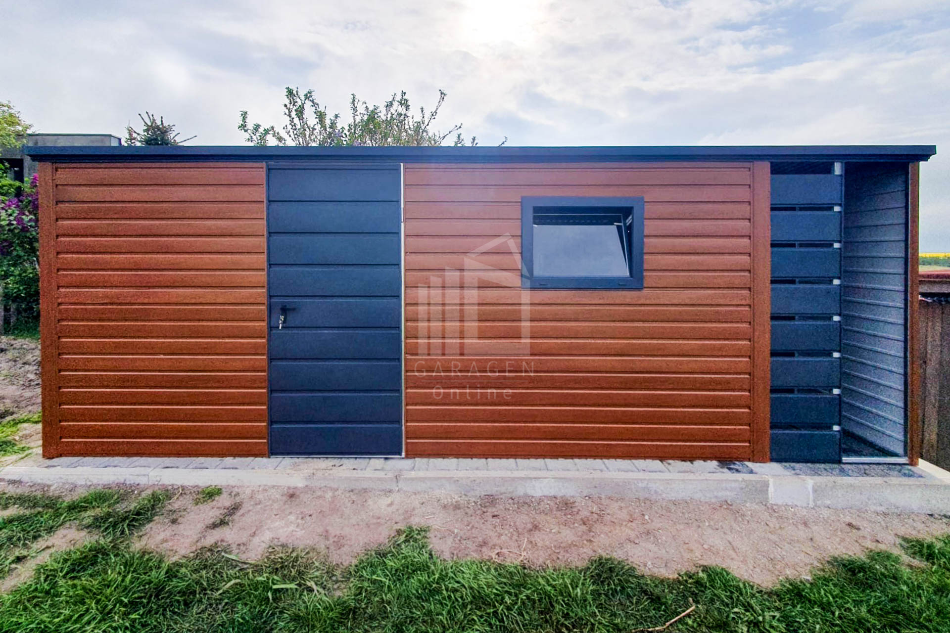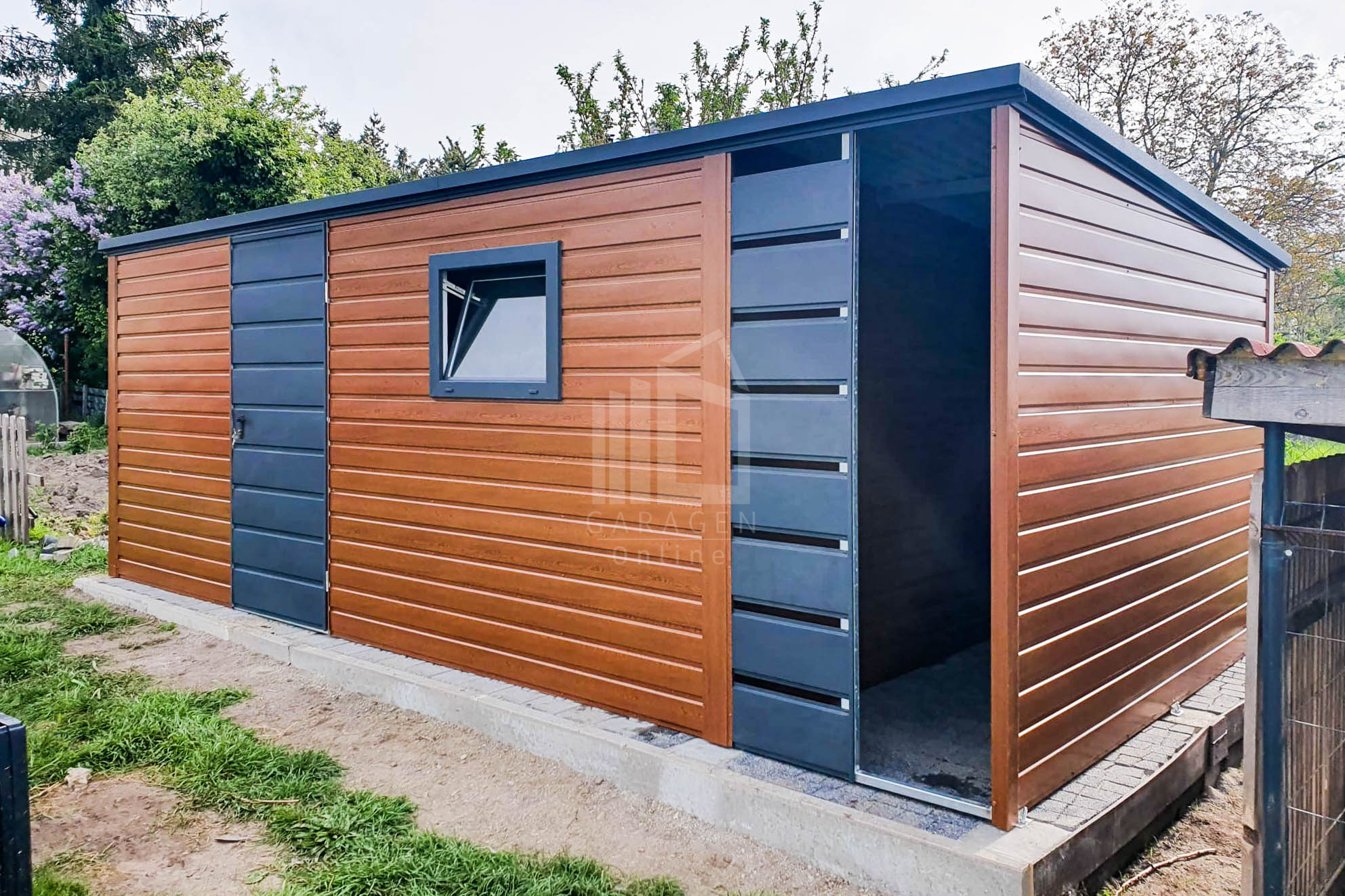 - und Rückwand sind vollständig mit T7-Trapezblech verkleidet, die Vorderwand ist auf einer Höhe von 50 cm mit Paneelen verkleidet Farbe: Anthrazit Mat BTX 7016