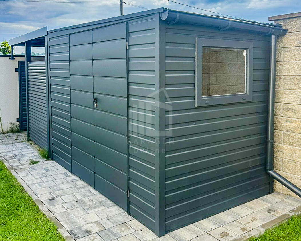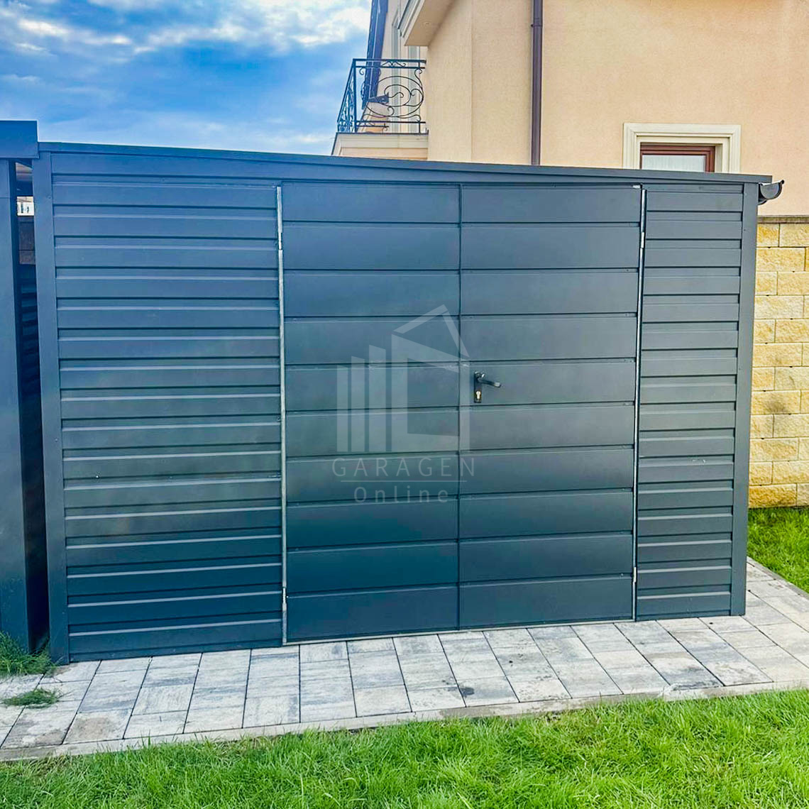 Gartenhaus – Gartenschuppen 4×1,5m – Zweiflügeliges Tor – Anthrazit – Dachrinnen – PVC Kippfenster – Flachdach ID615