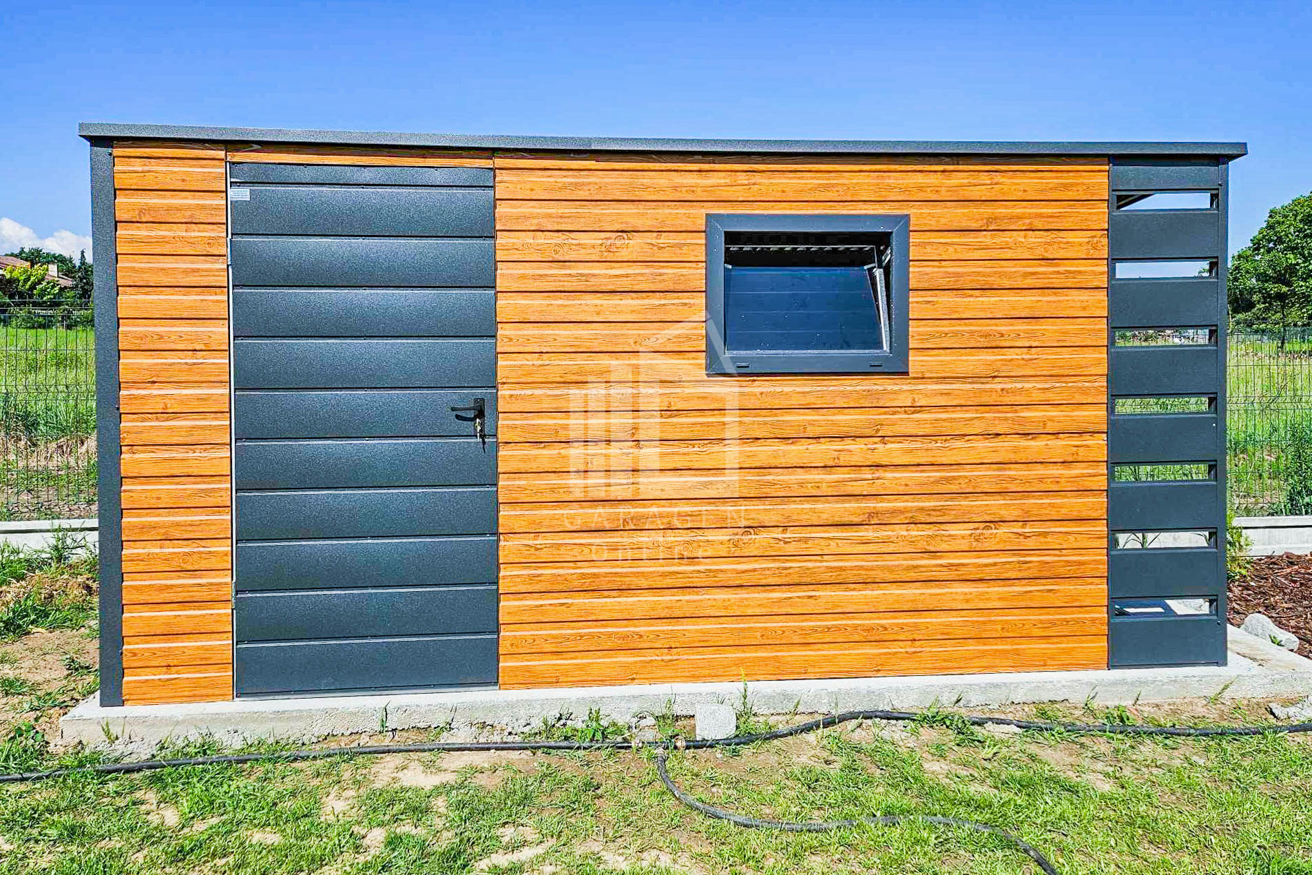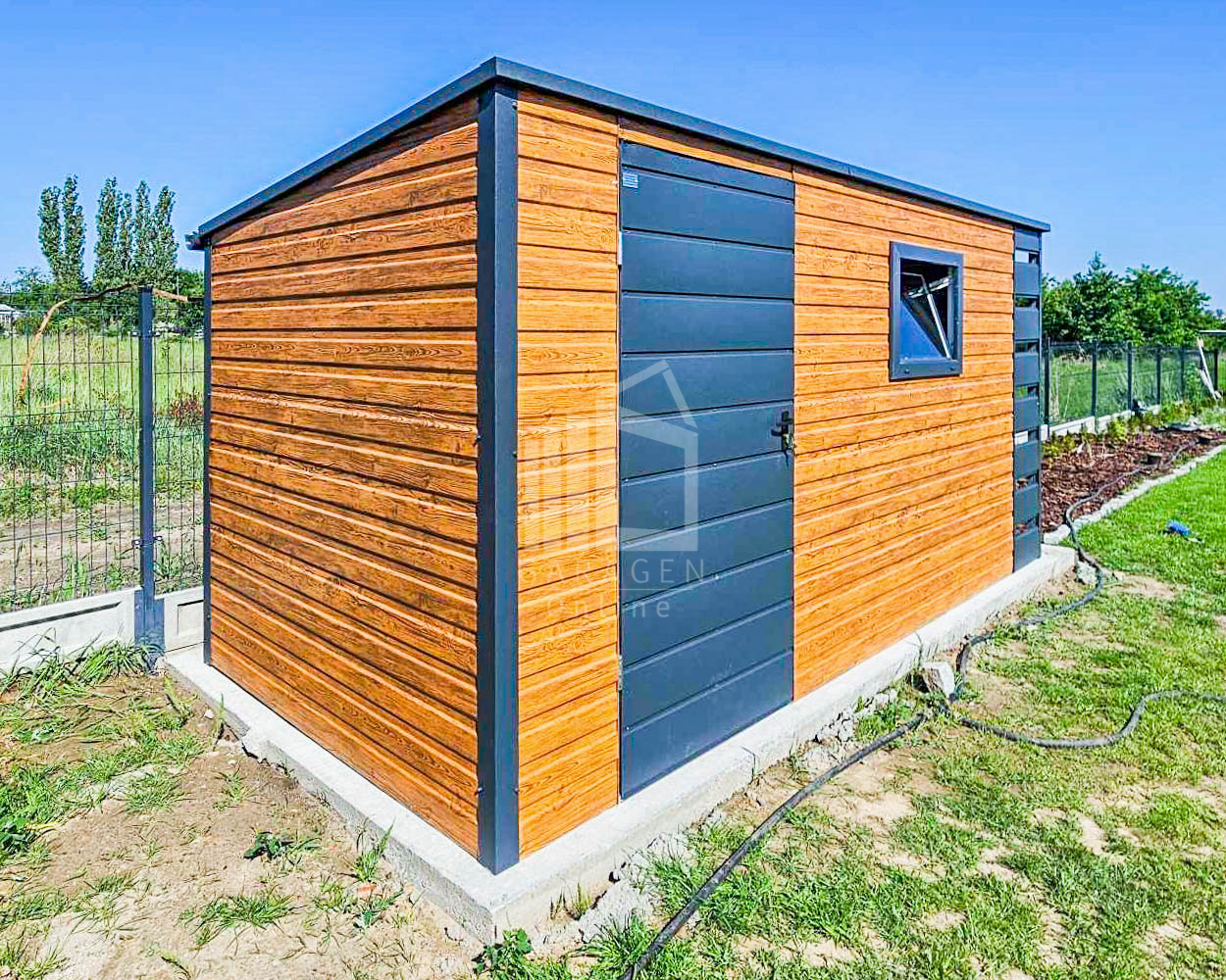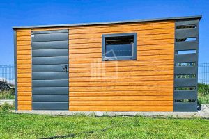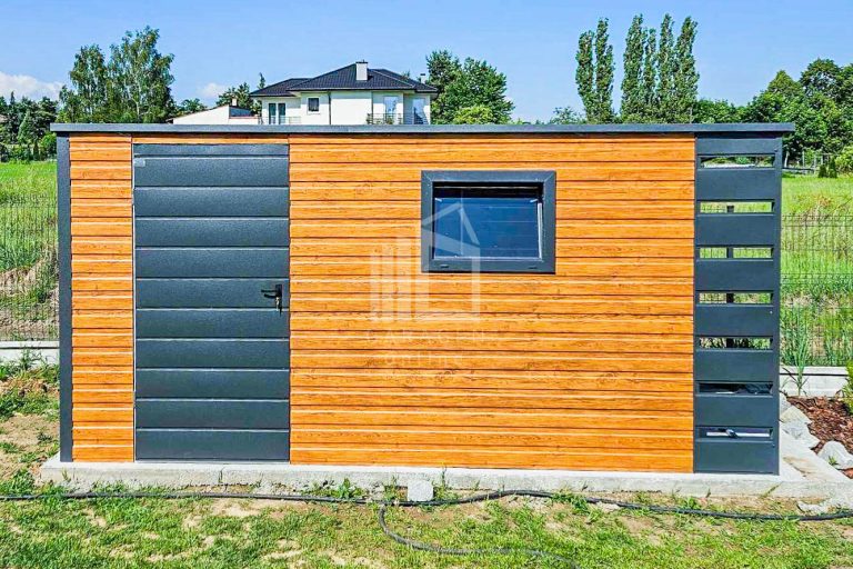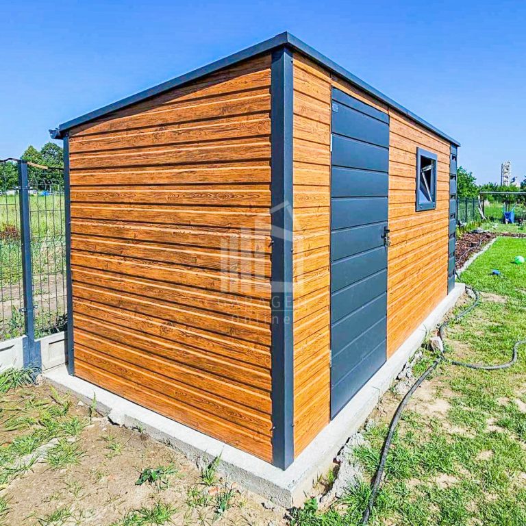 Gartenhaus – Gartenschuppen 4x2m + Überdachung 0,5m – Tür – PVC Kippfenster – Helles Walnussholz – Holzoptik – Anthrazit – Flachdach ID656