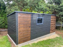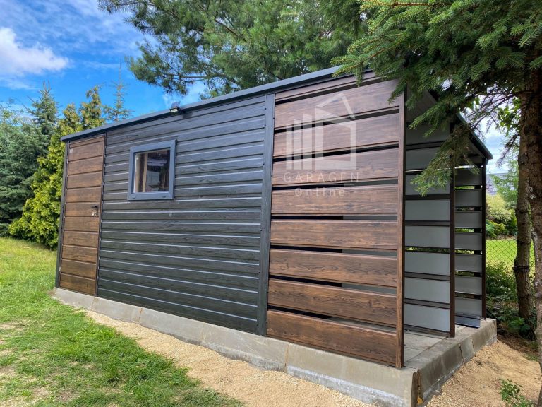 Gartenhaus – Gartenschuppen 4x3m + Überdachung 1m – PVC Kippfenster – Holzoptik – Norwegische Kiefer – Flachdach GP622