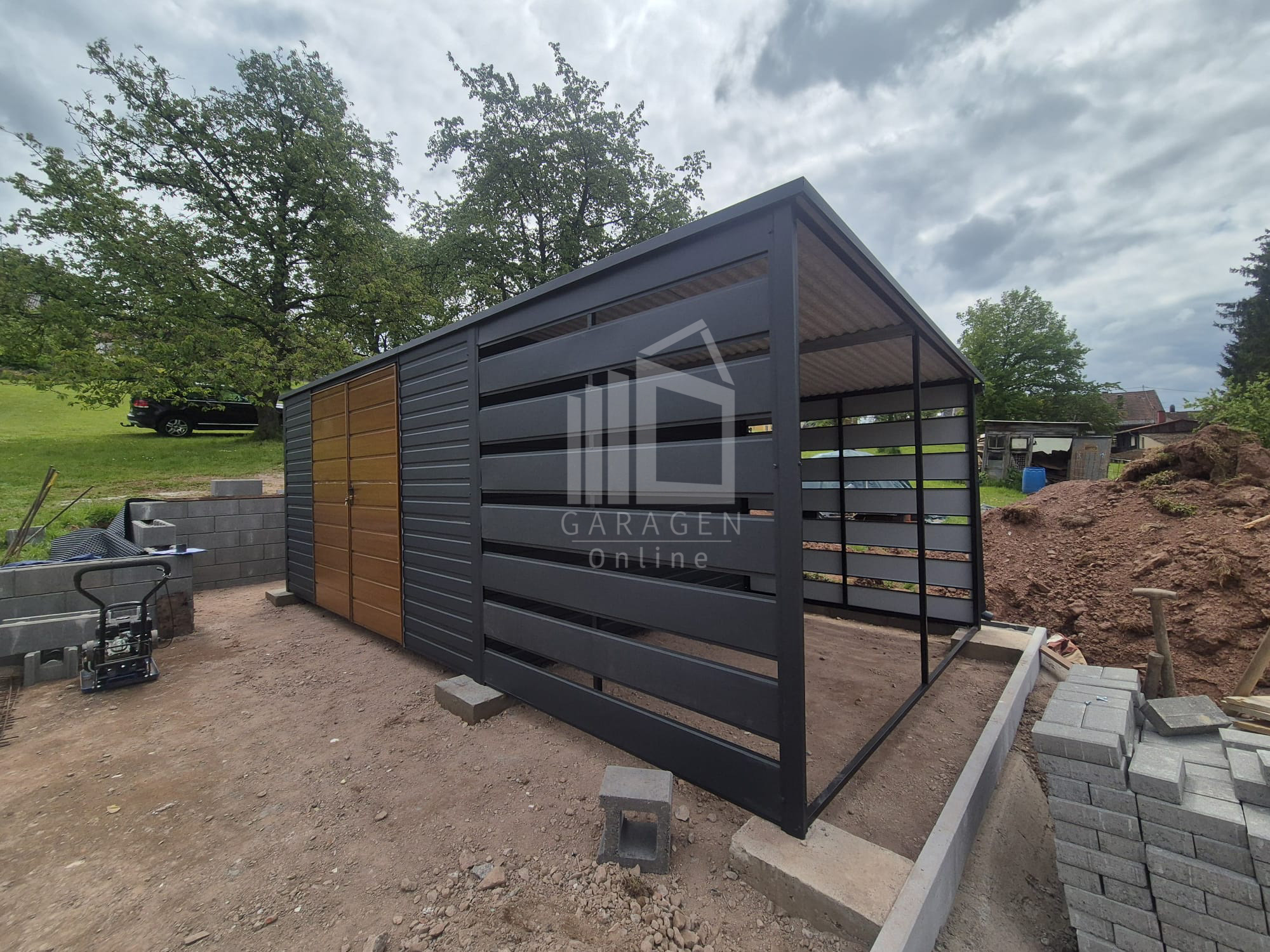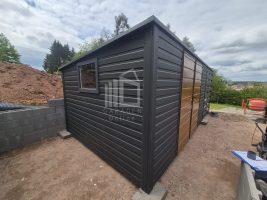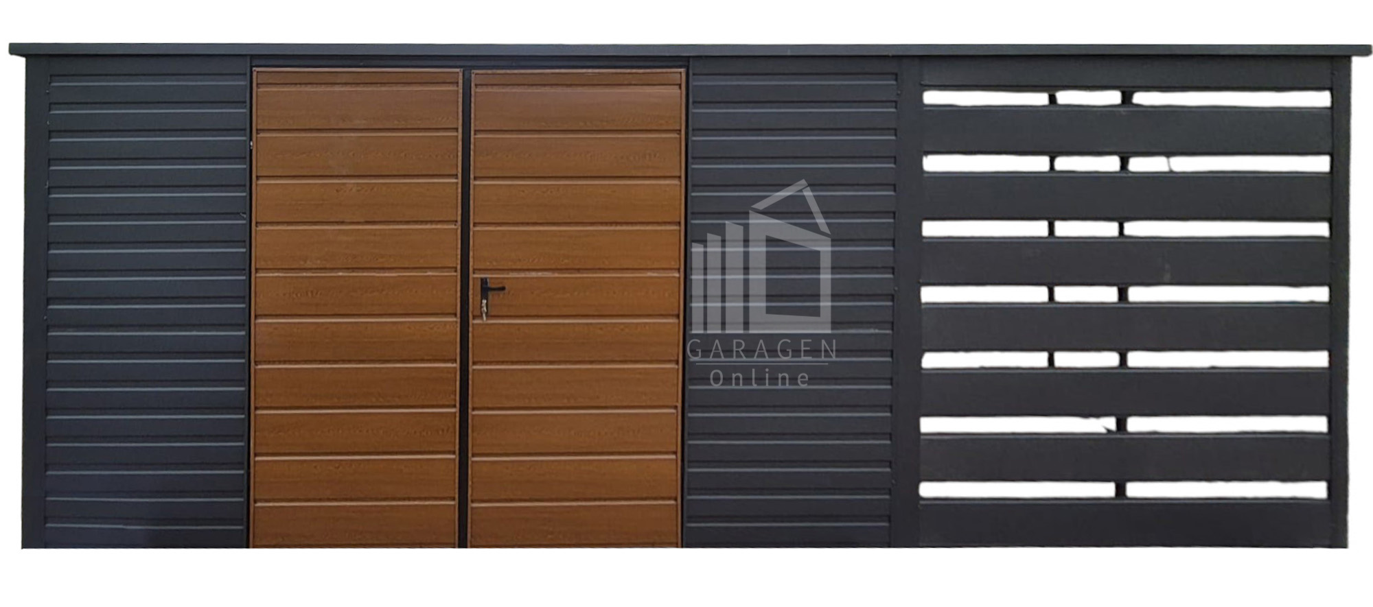 Gartenhaus – Gartenschuppen 4x3m + Überdachung 2m – Zweiflügeliges Tor – PVC Kippfenster – Anthrazit – Holzoptik – Dachrinnen – Flachdach GP616