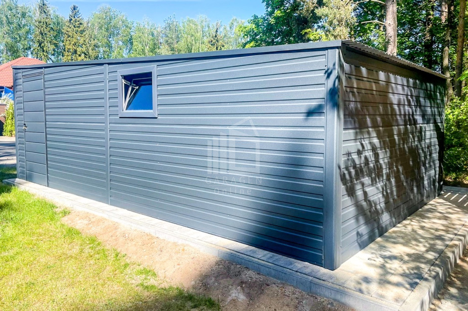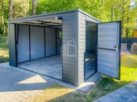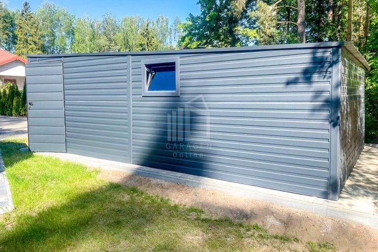 Blechgarage 4x8m – Schwingtor – Tür – 2x PVC Kippfenster – Anthrazit – Flachdach GP407