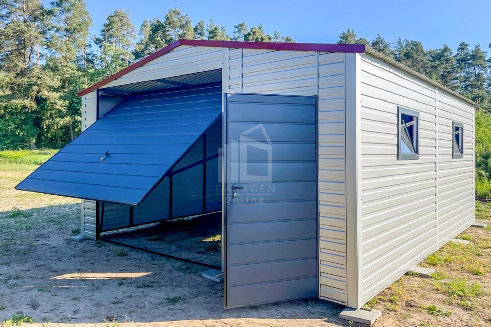 Blechgarage 5x6m – Schwingtor – Tür – 2x PVC Kippfenster – Silber – Kirsche – Anthrazit – Satteldach GP416
