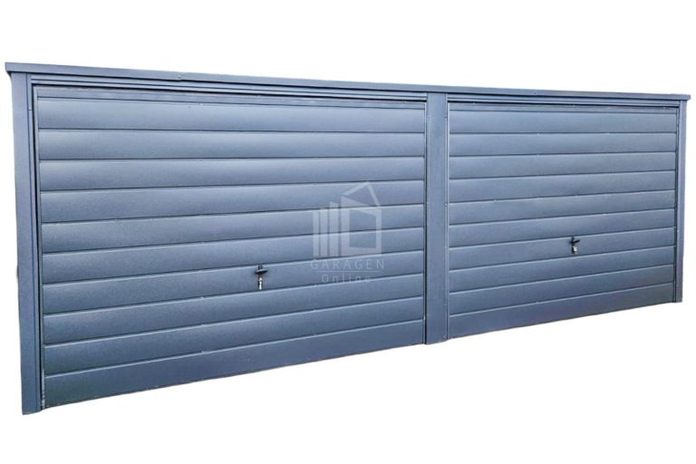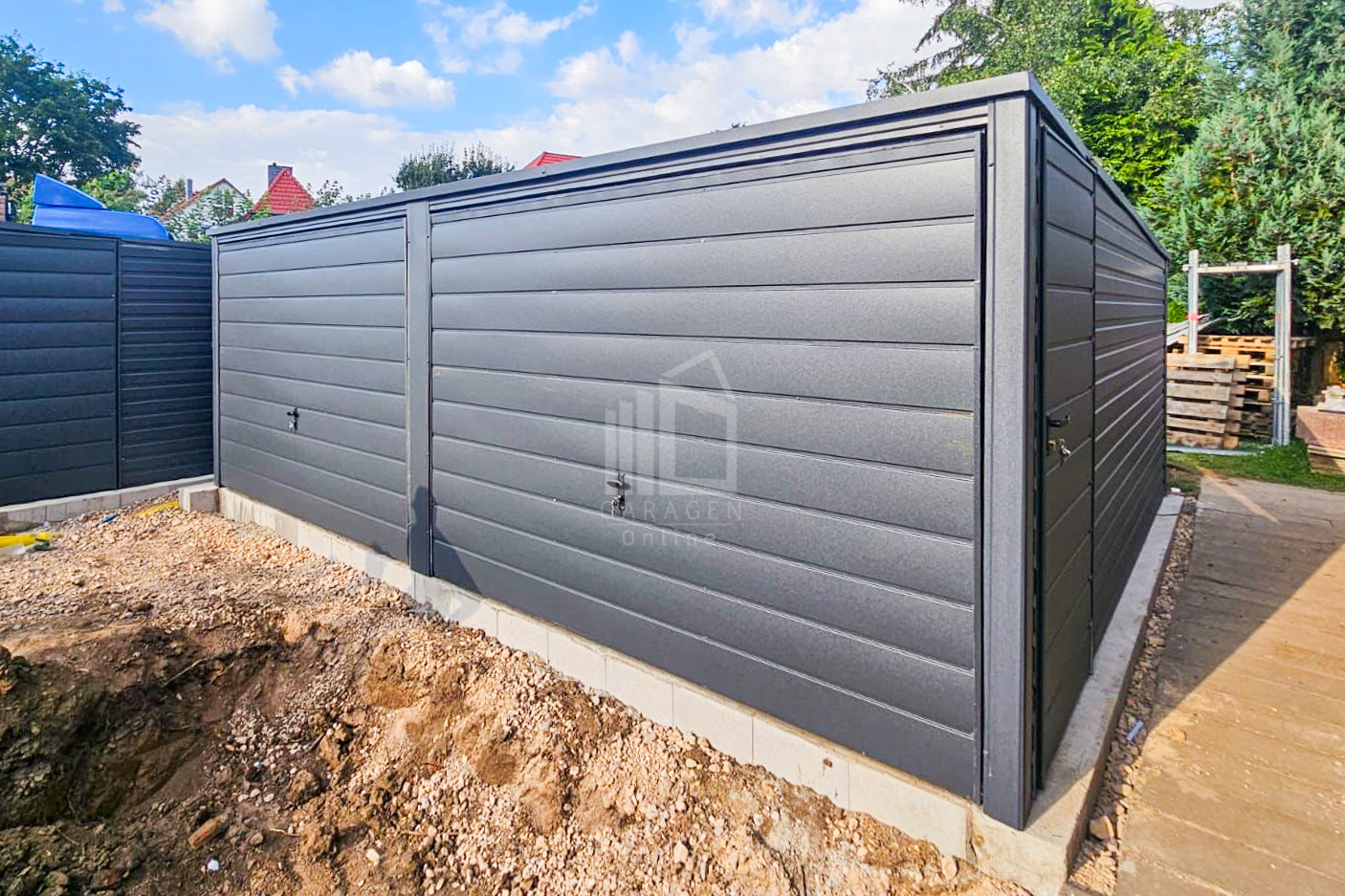 Blechgarage 6x6m – 2x Schwingtor – Tür – 2x PVC Kippfenster – Anthrazit – Dachrinnen – Flachdach GP421