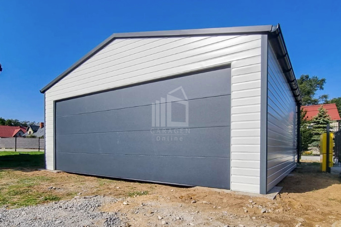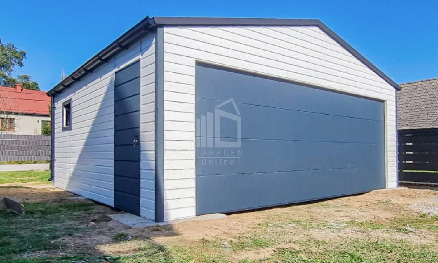 Blechgarage 6x6m – Sektionaltor – Tür – PVC Kippfenster – Weiß – Dachrinnen – Satteldach | ID666 |
