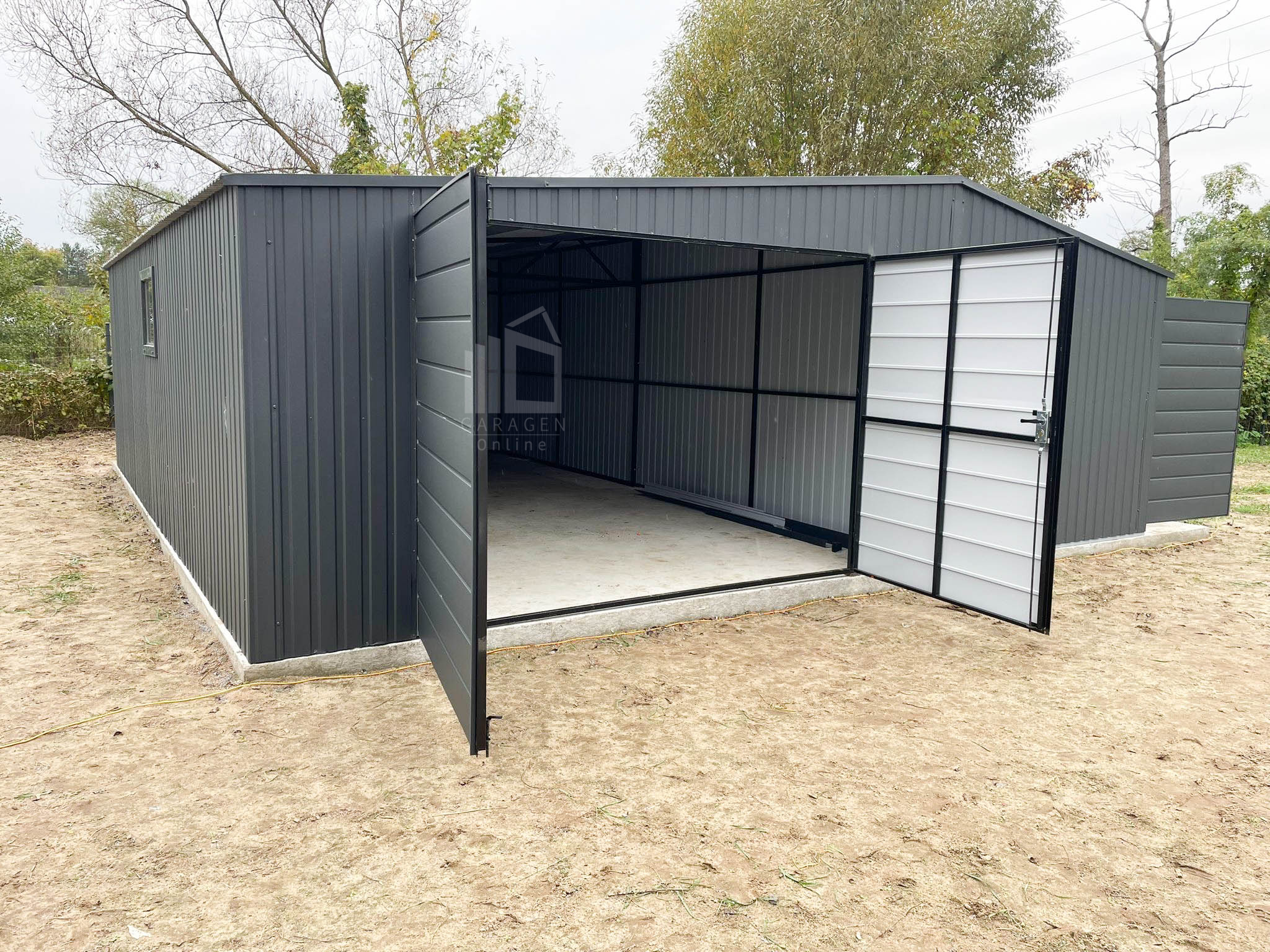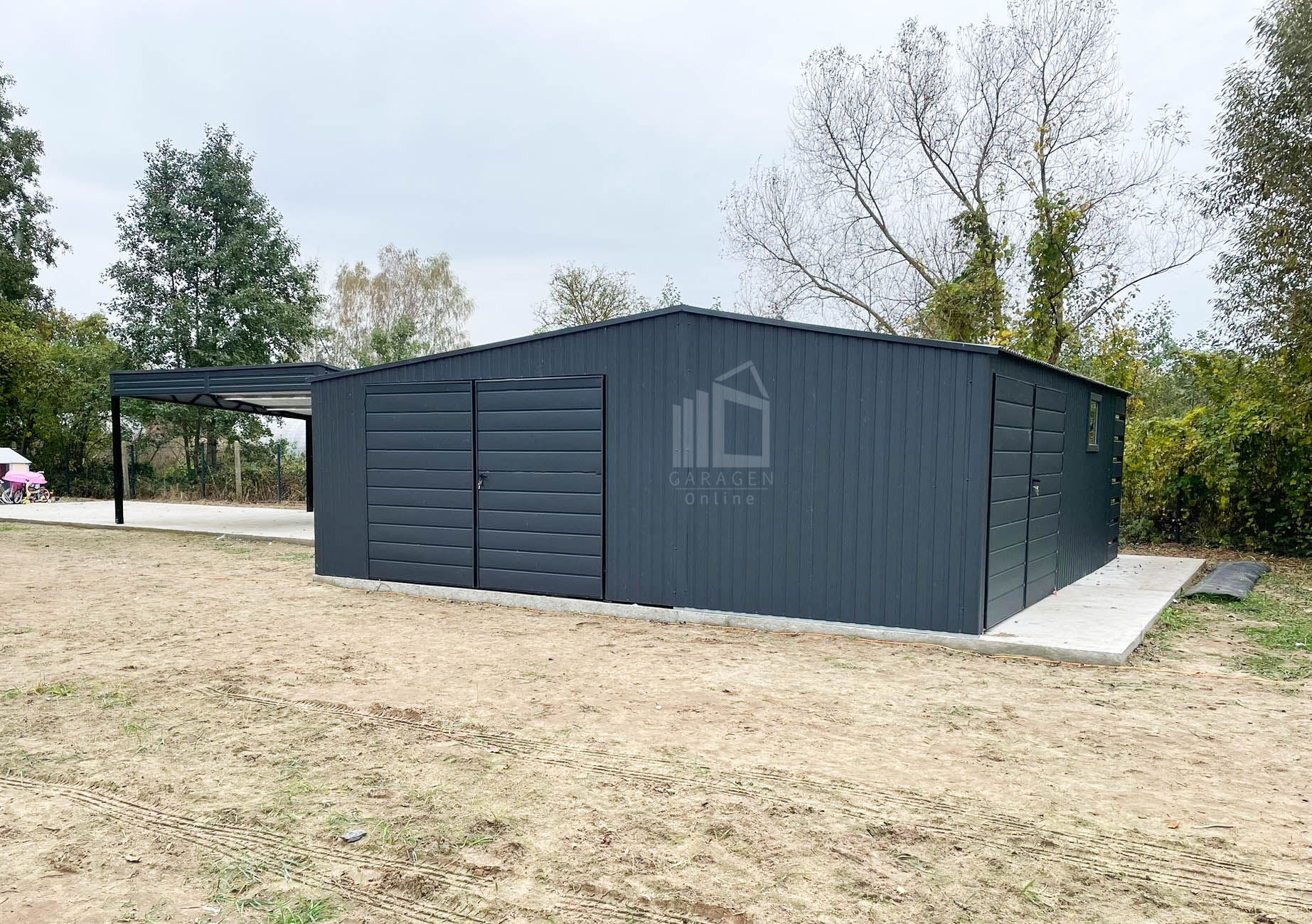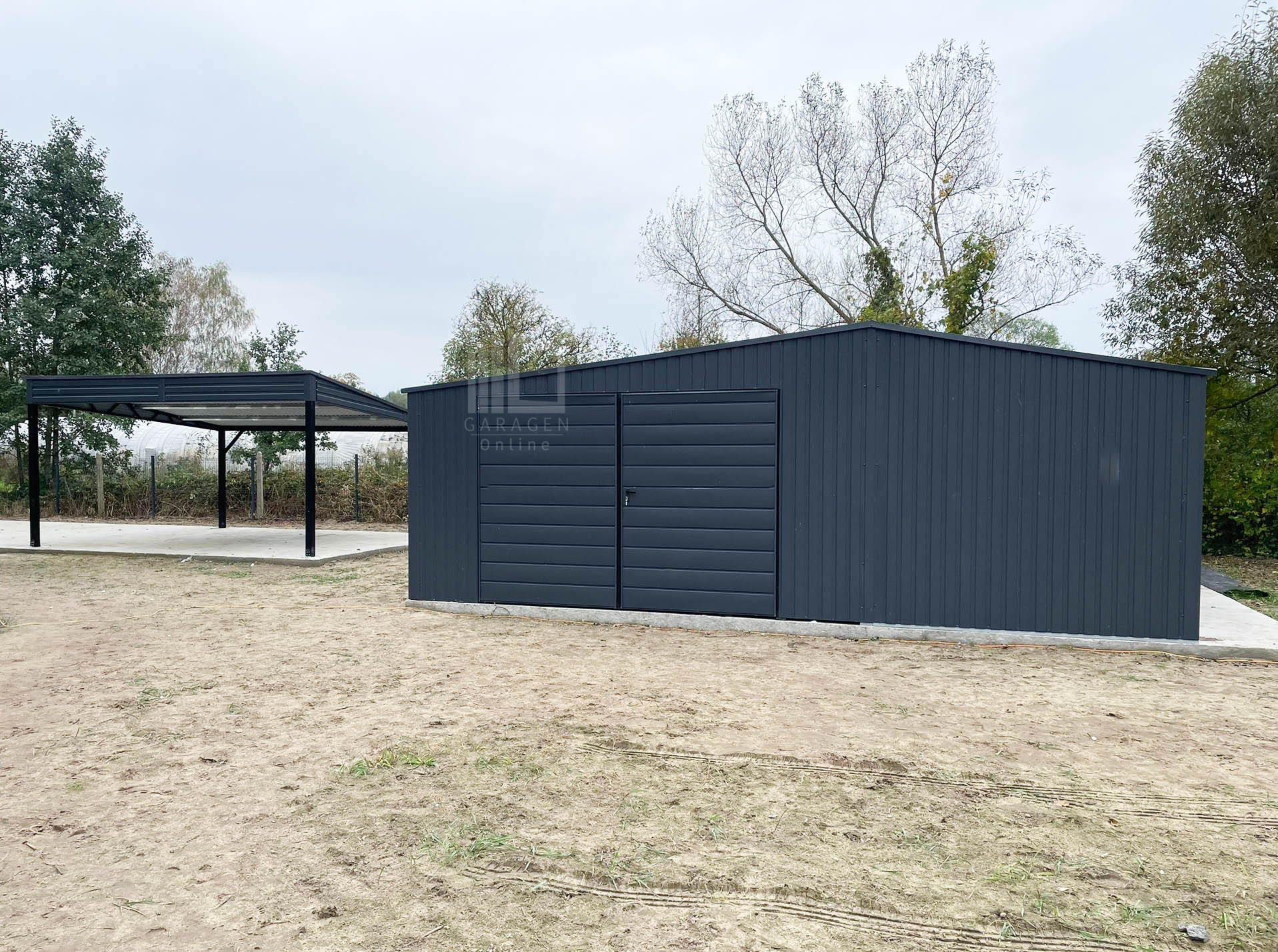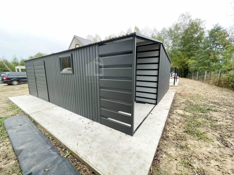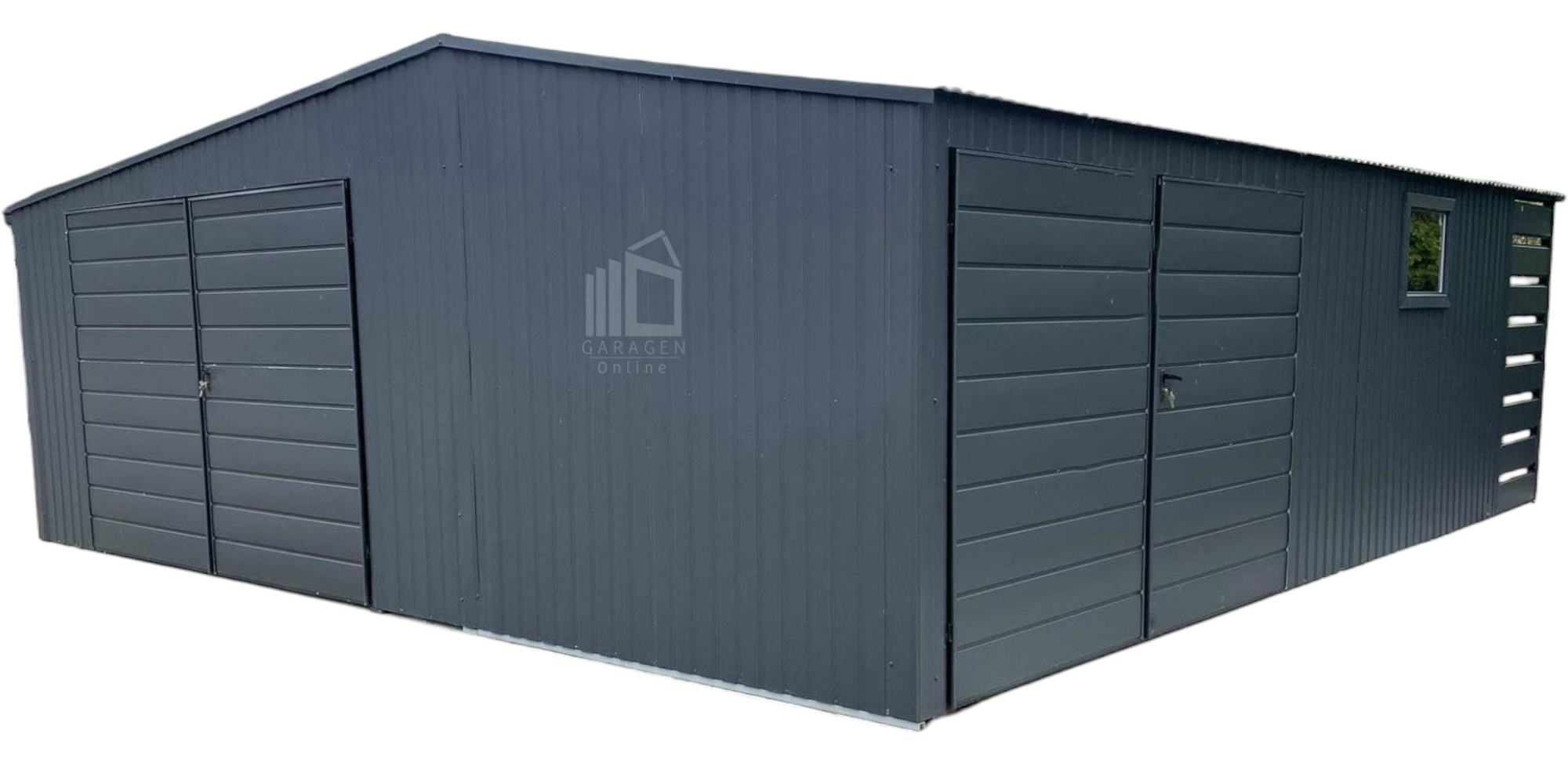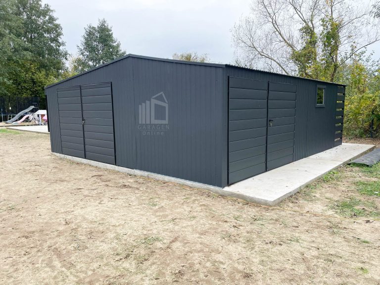 Blechgarage 7×7,5m + Wandnische in der Garage 2,5m – 2x Zweiflügeliges Tor – 2x PVC Kippfenster – Anthrazit – Satteldach GP481