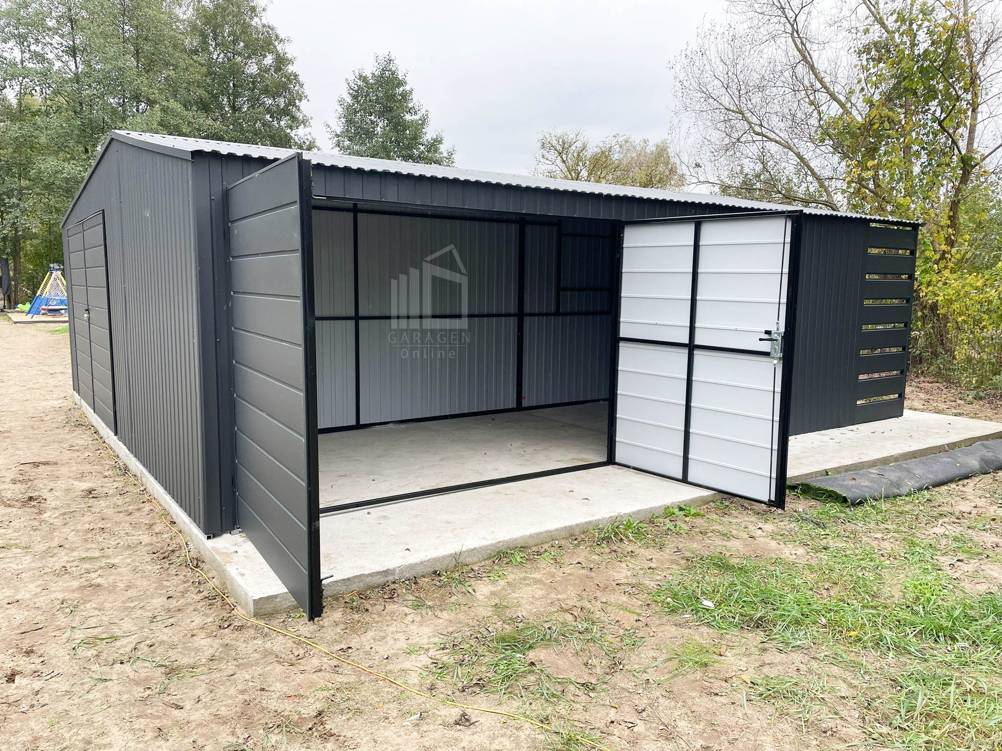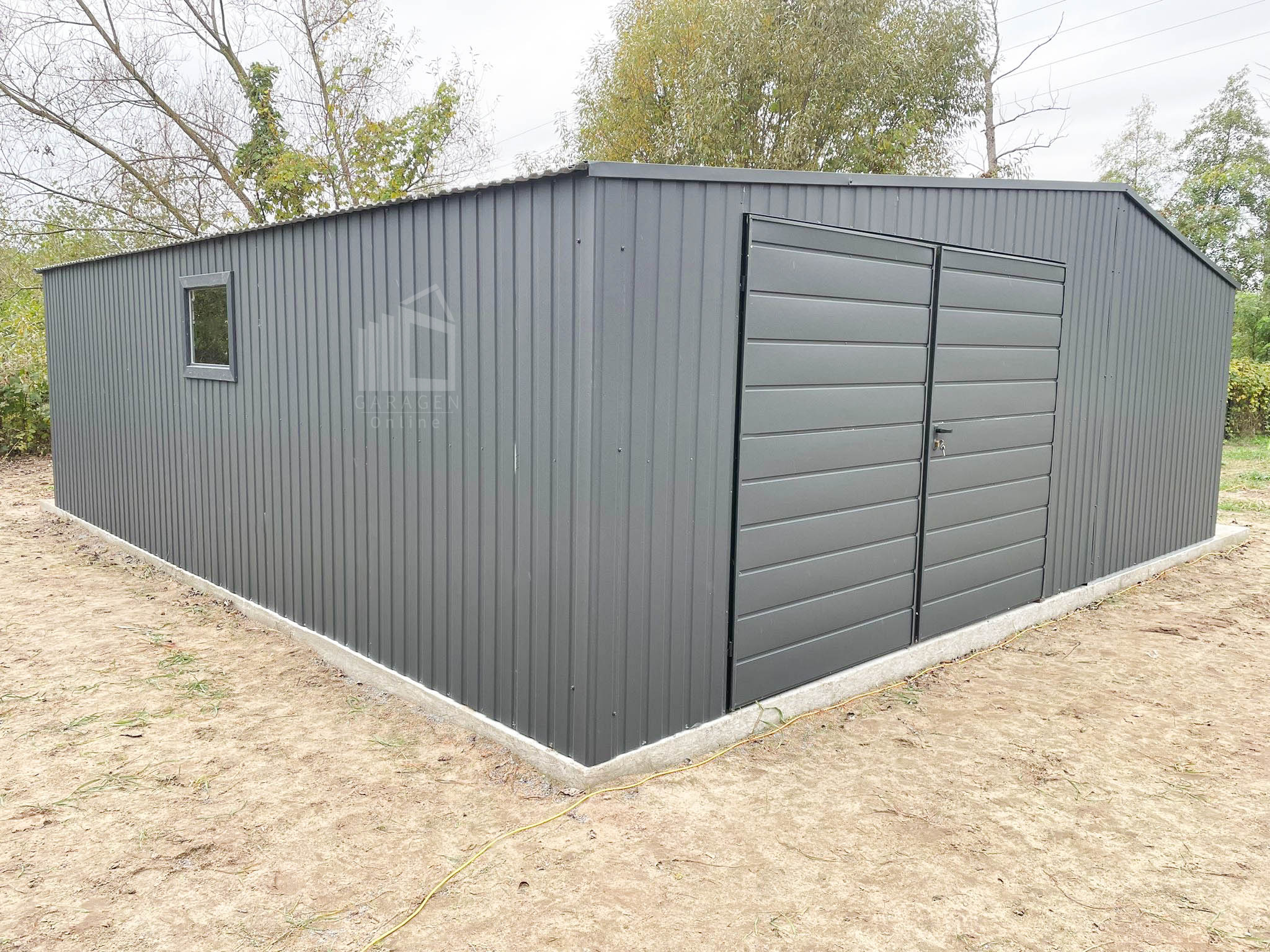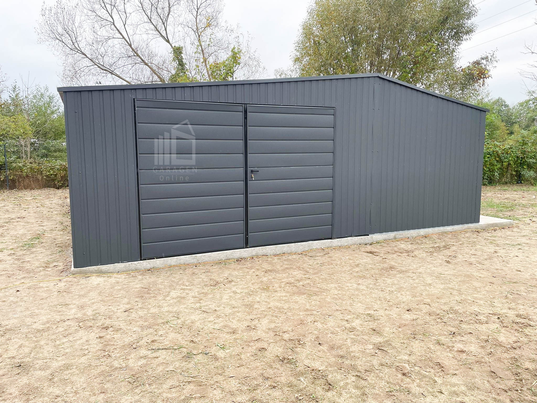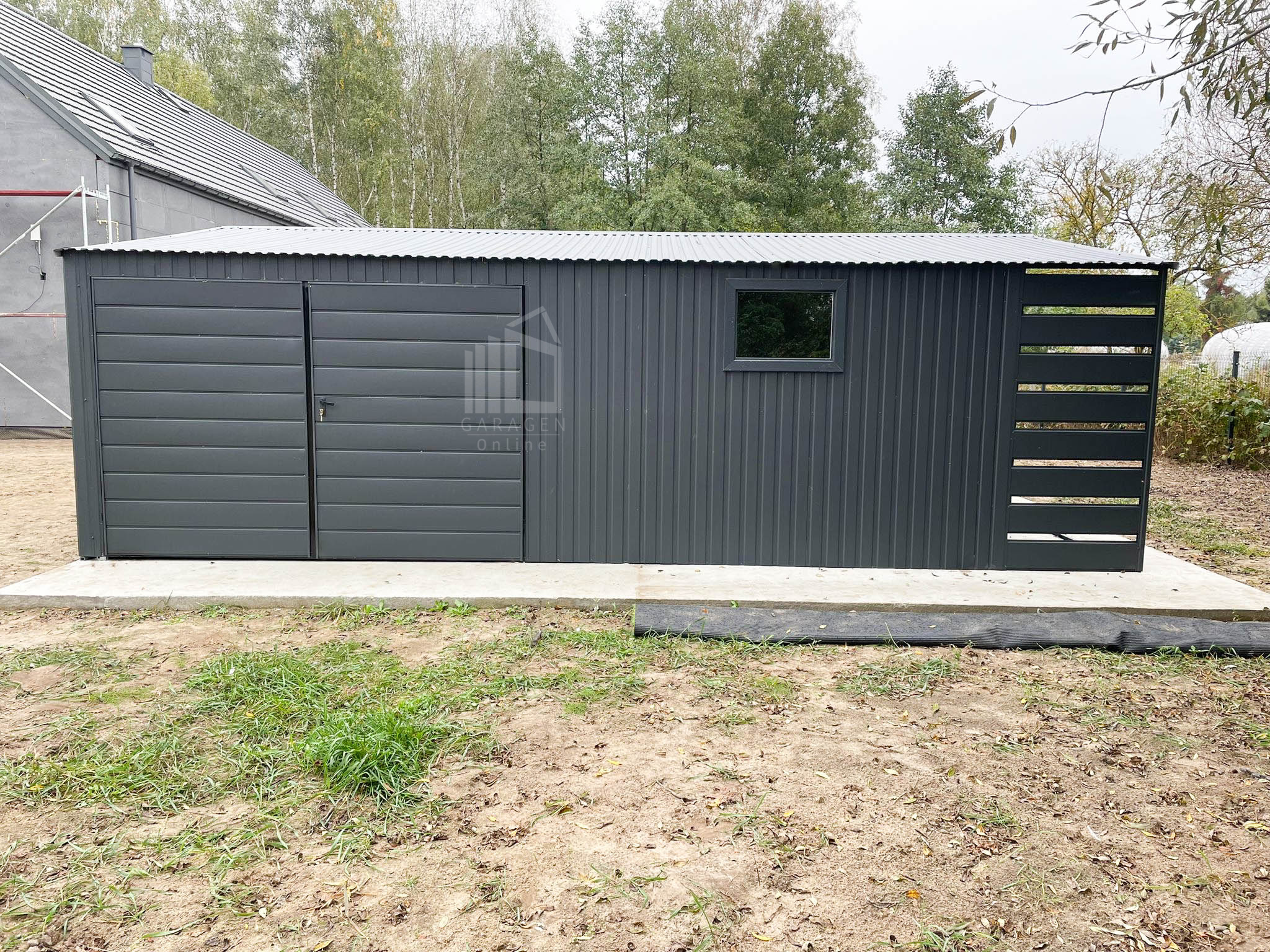 Blechgarage 7×7,5m + Wandnische in der Garage 2,5m – 2x Zweiflügeliges Tor – 2x PVC Kippfenster – Anthrazit – Satteldach GP481