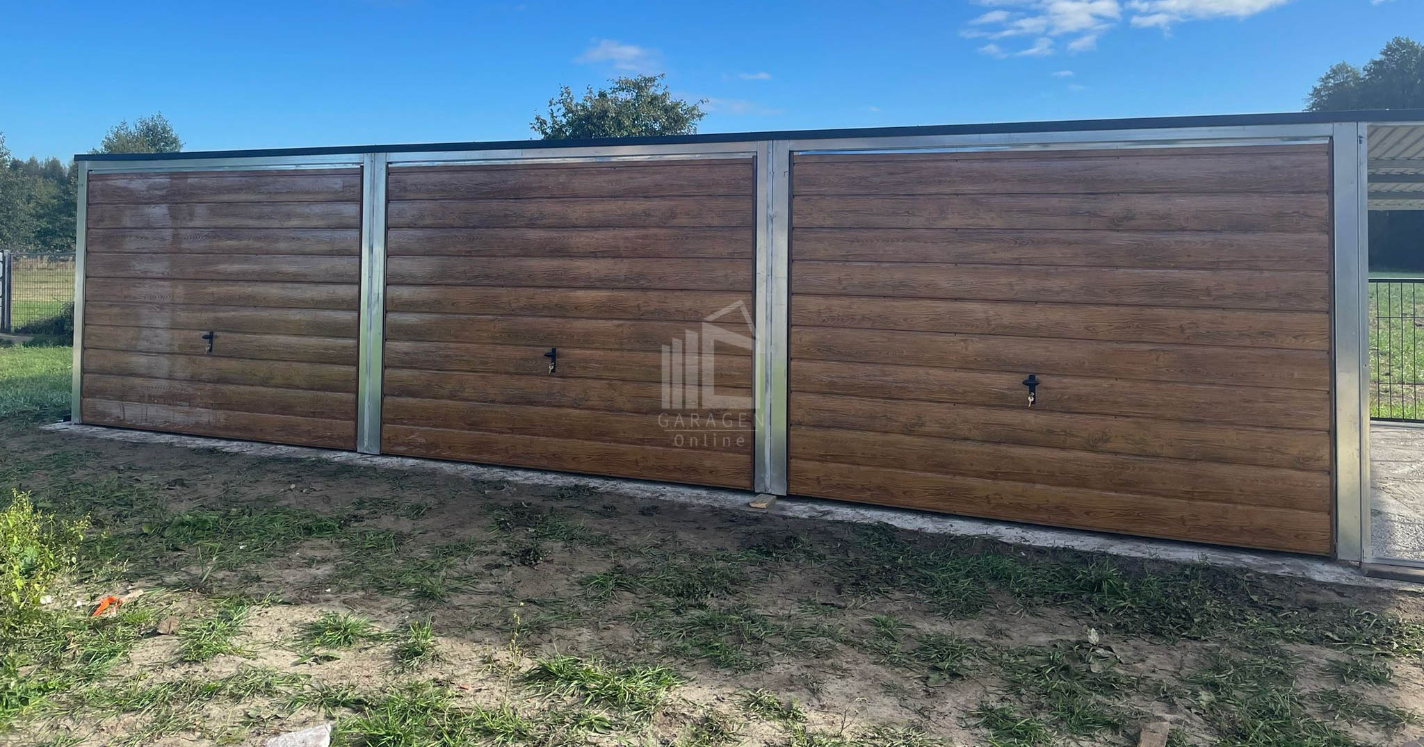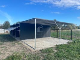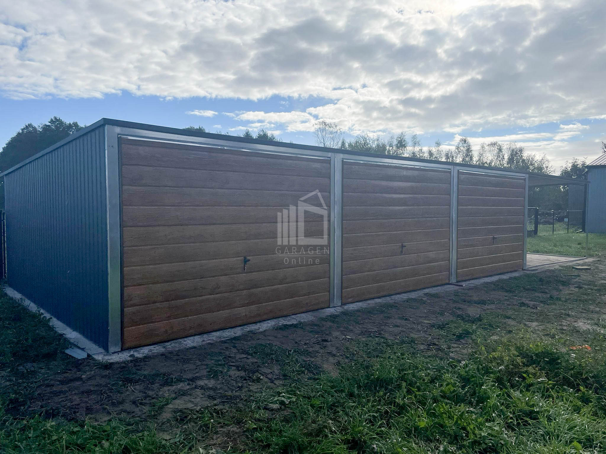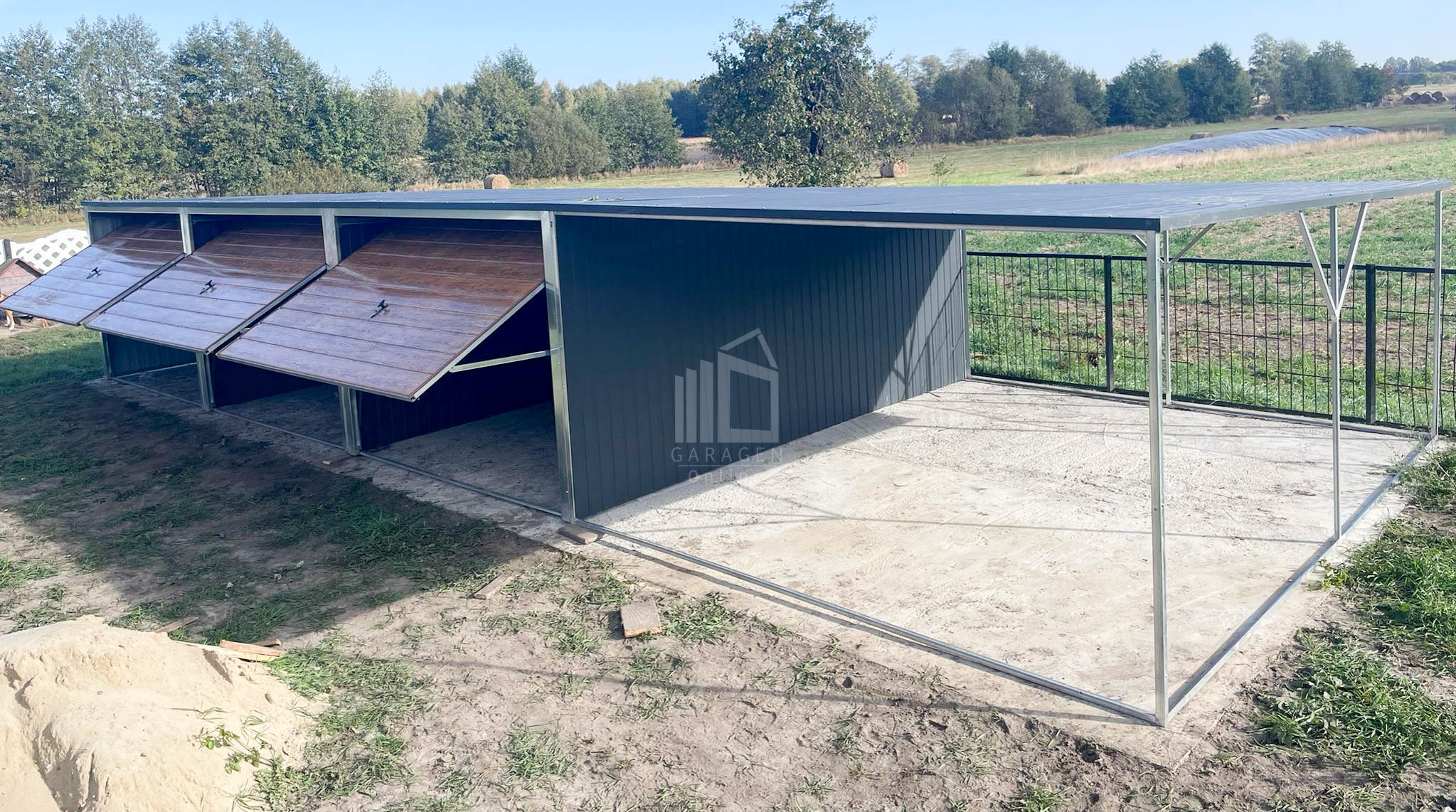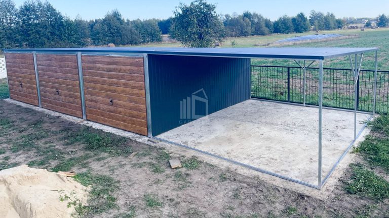 Blechgarage 9x6m – Überdachung 3m x 6-Schwingtor – Anthrazit – Helles Walnussholz – Pultdach GP226
