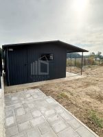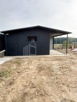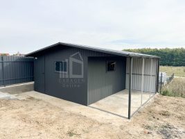 Blechgarage – Gartenschuppen 4x6m + Überdachung 2m – Tür – 2x PVC Kippfenster – Anthrazit – Dachrinnen – Satteldach ID921