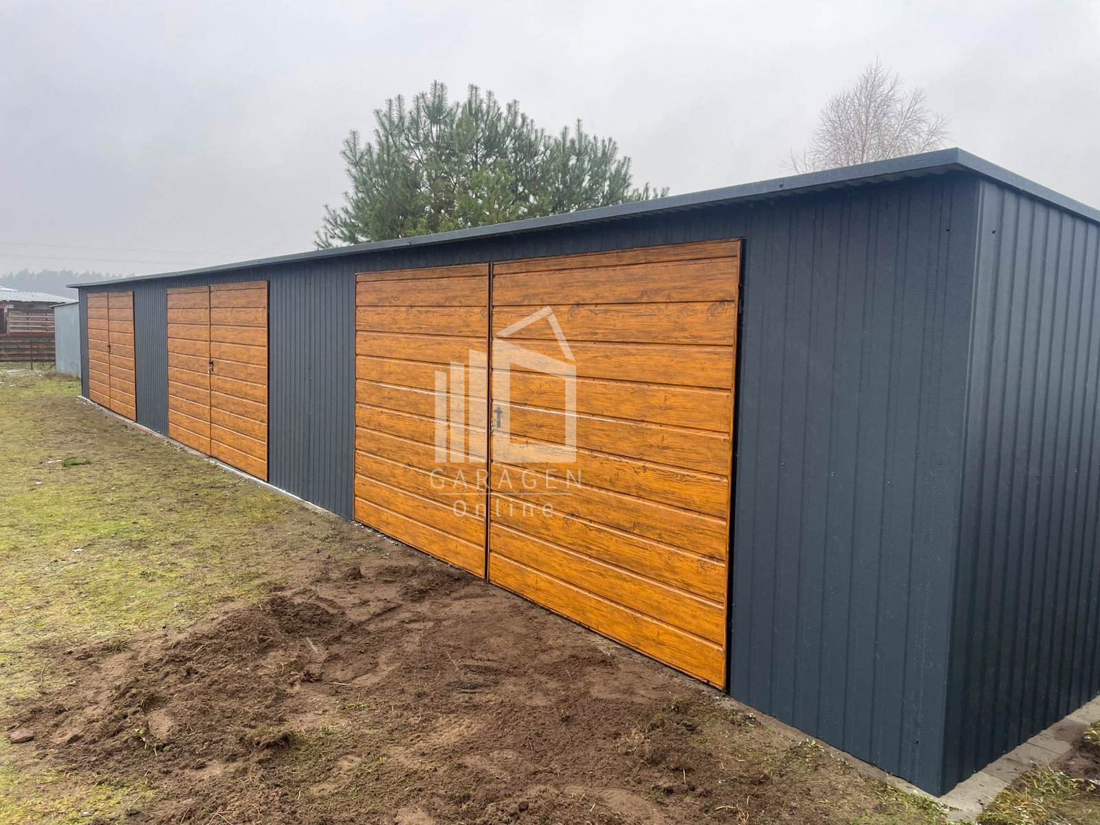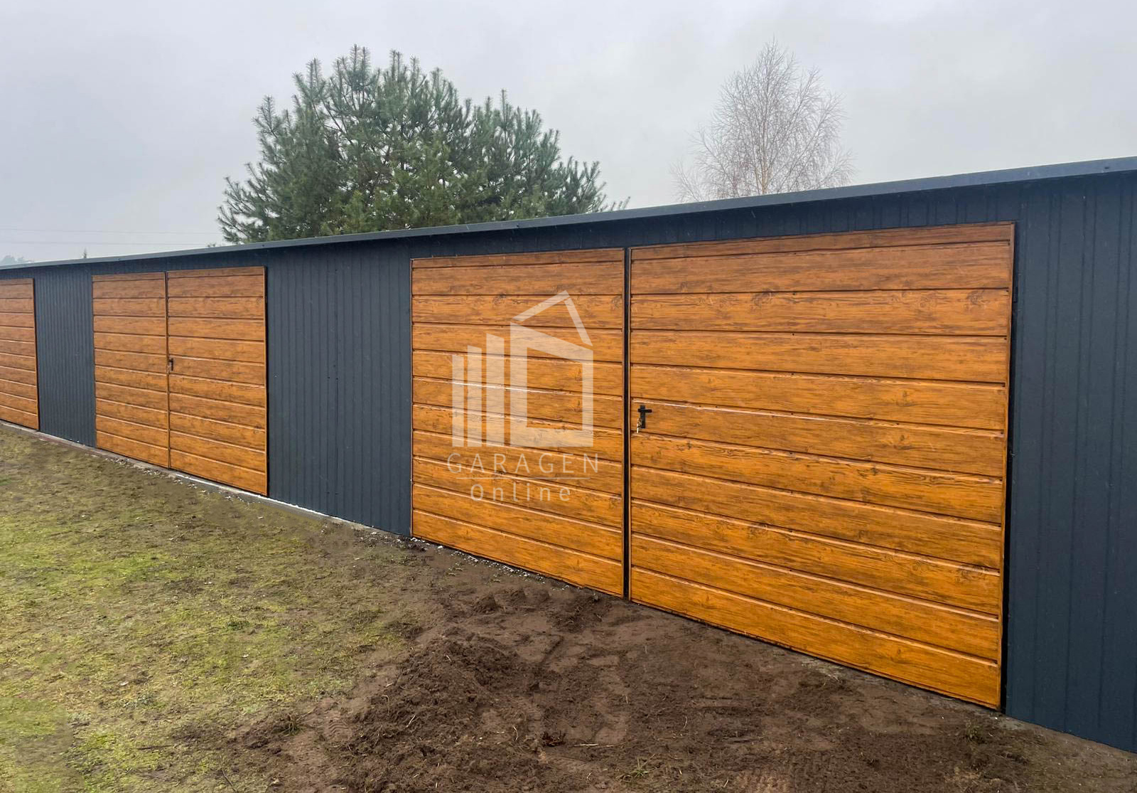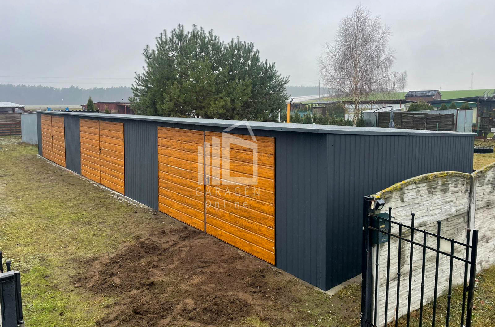 Reihengaragen – Garagenkomplex 18x5m – 3x Zweiflügeliges Tor – Tür – Holzoptik – Anthrazit – Flachdach GP525