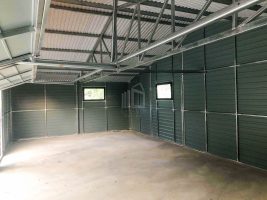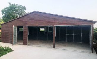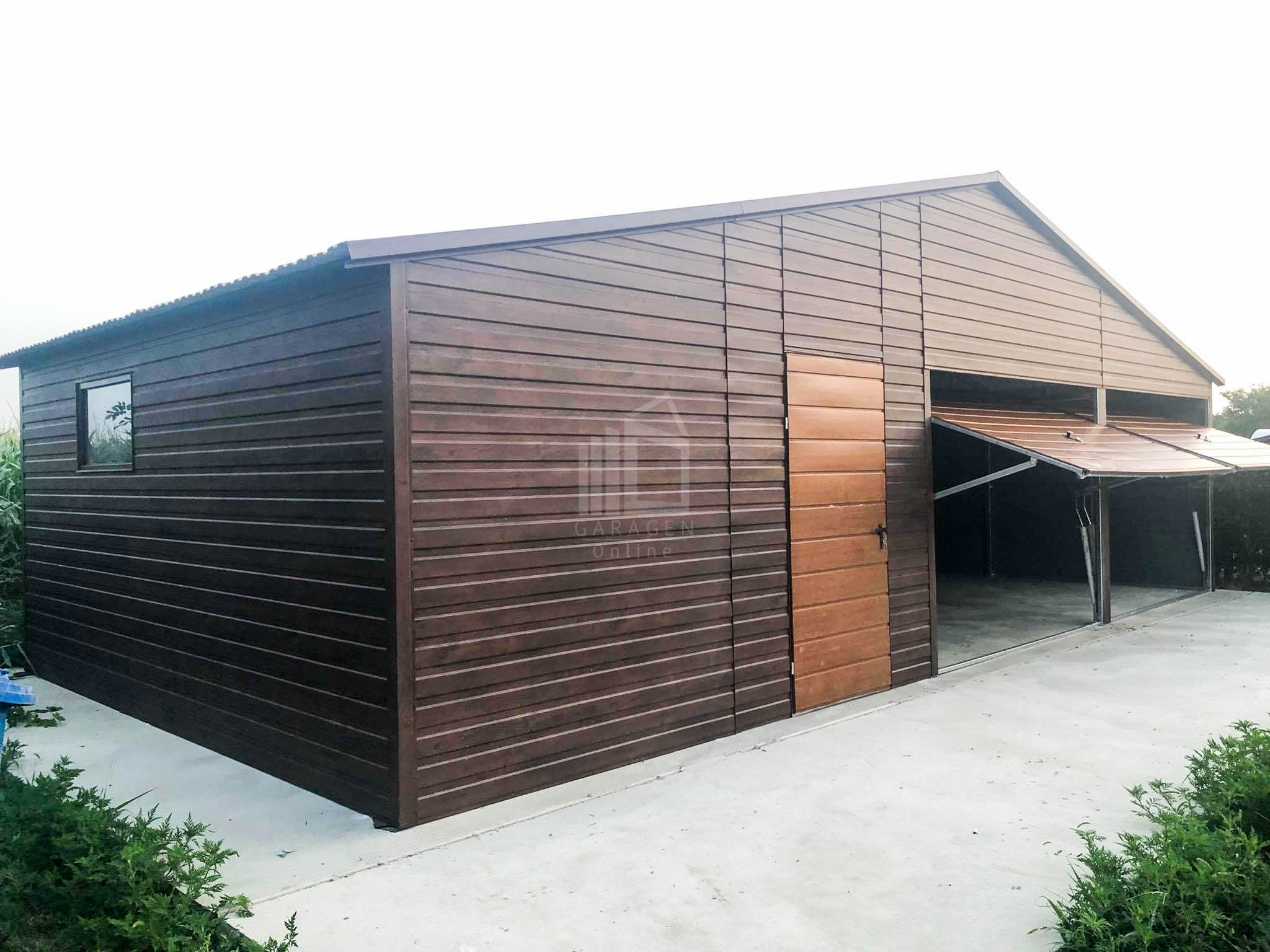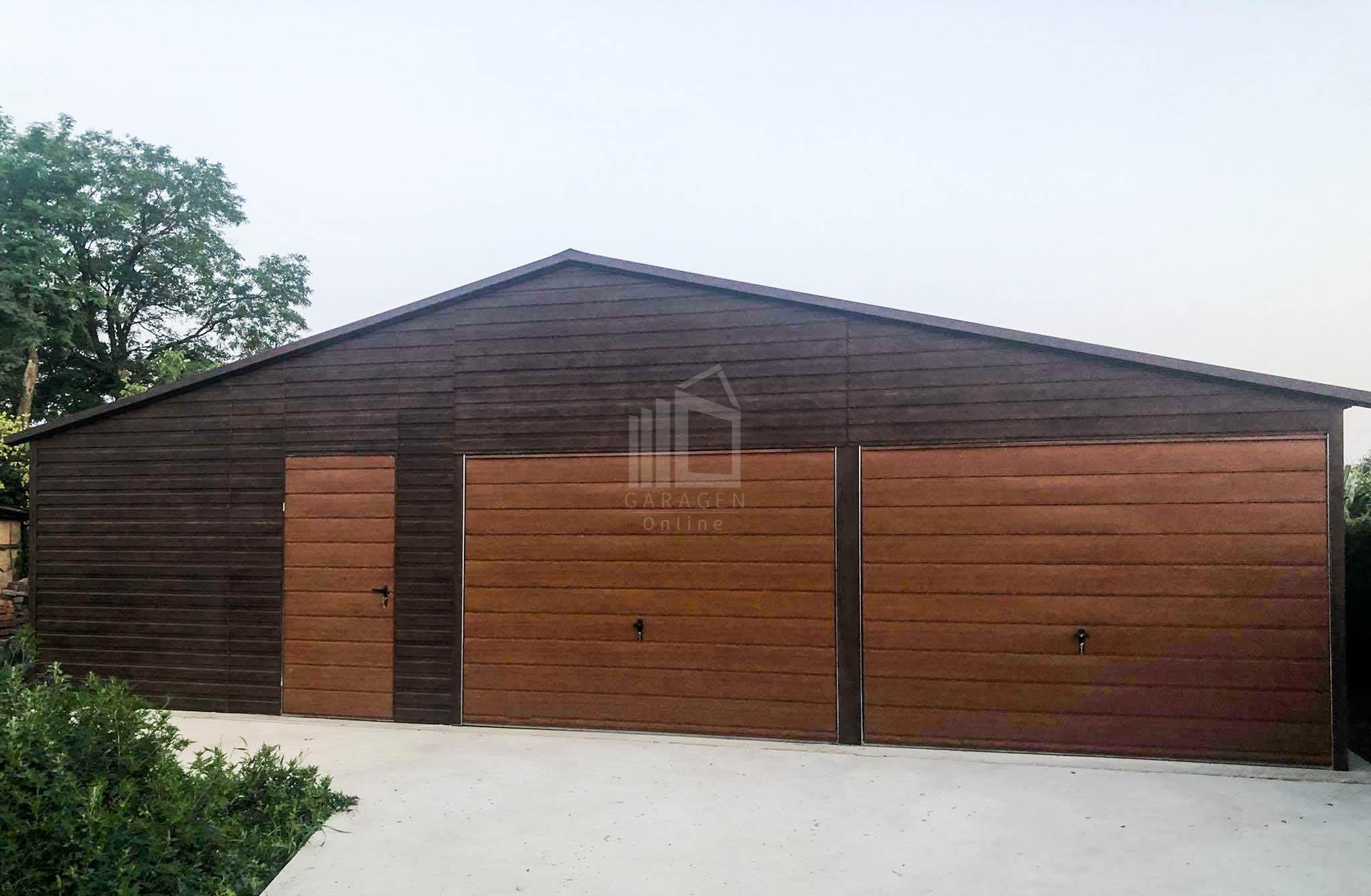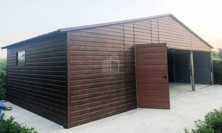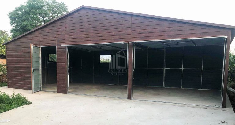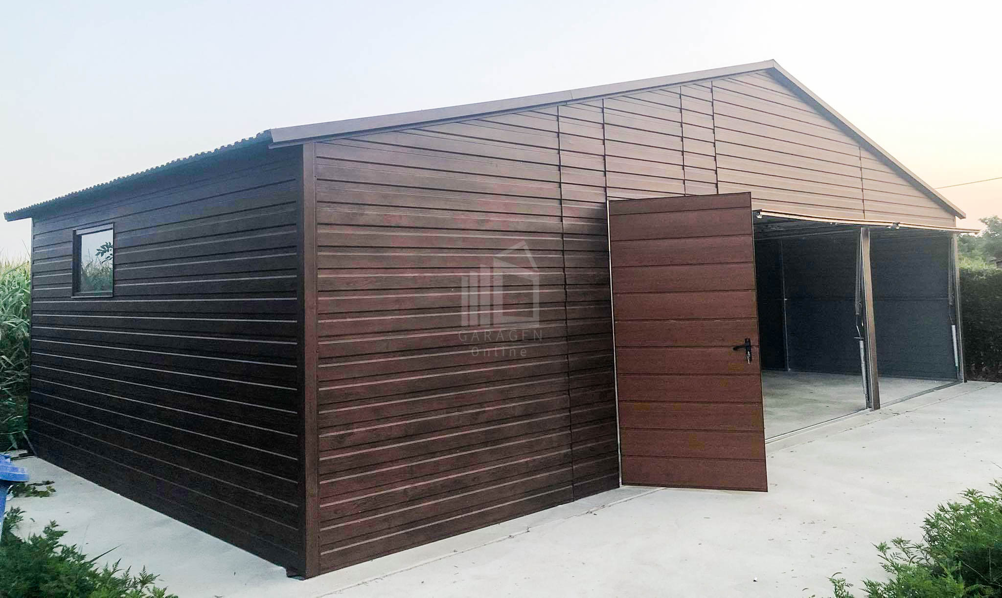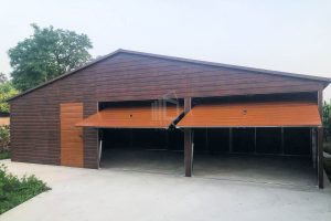 Blechgarage 10x5m 2x Schwingtor + Zusätzliche Tür – Holzoptik – Satteldach GP144