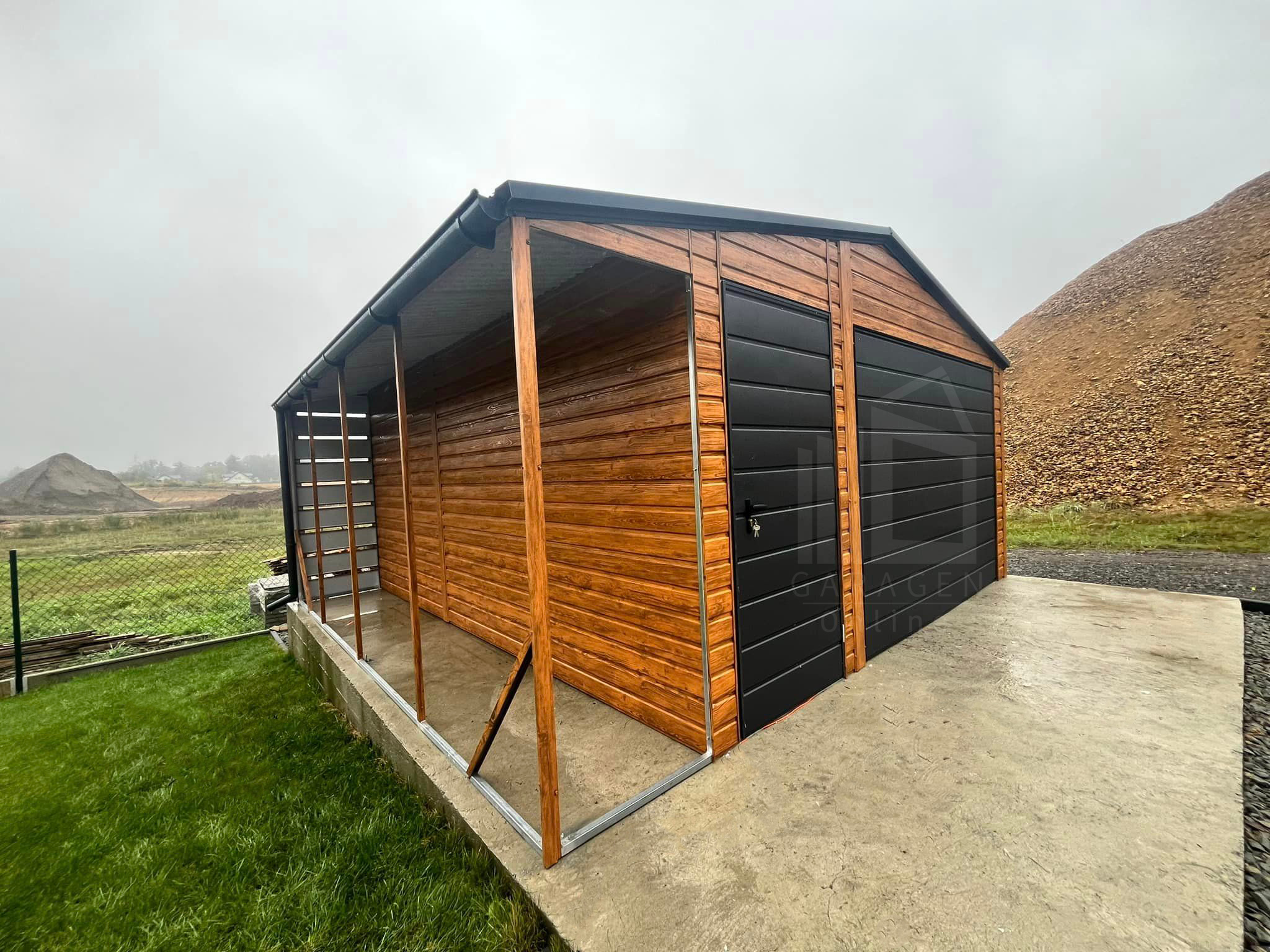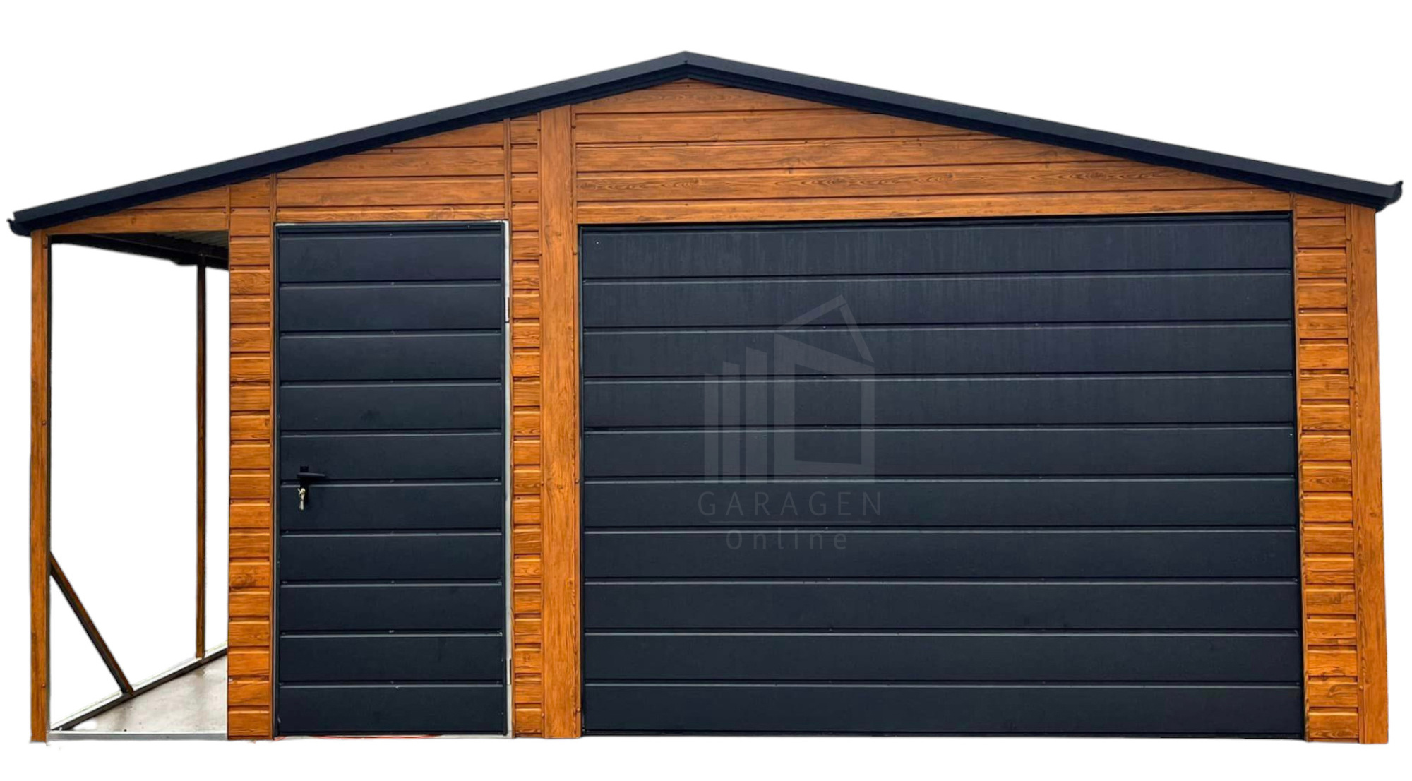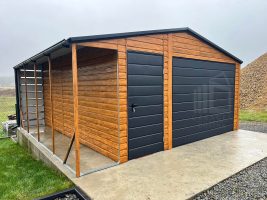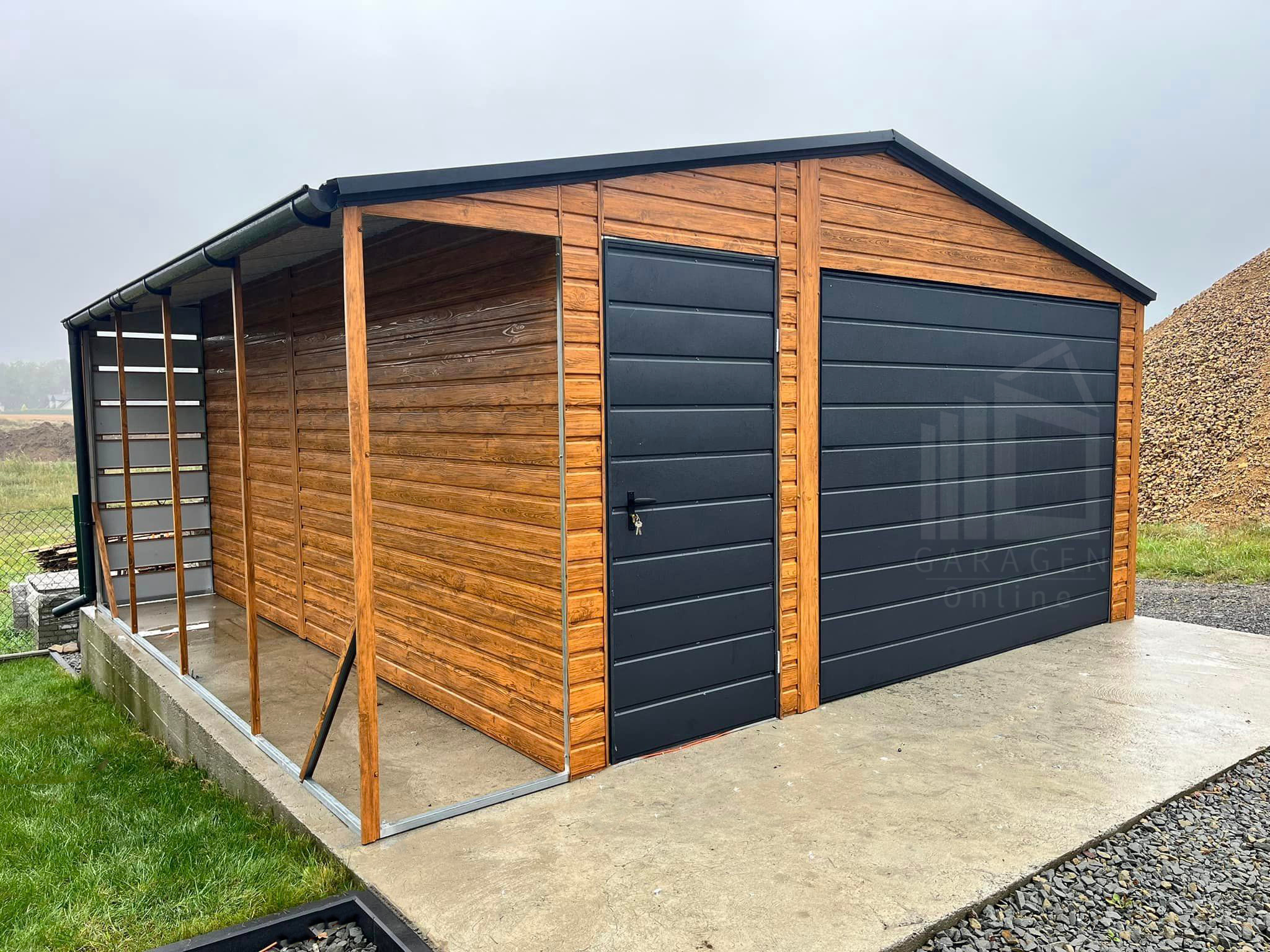 Blechgarage 4,5x5m + Überdachung 1m – Schwingtor – Dachrinnen – Helles Walnussholz – Satteldach ID712