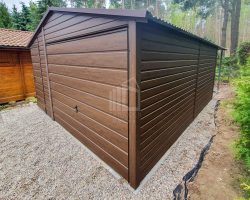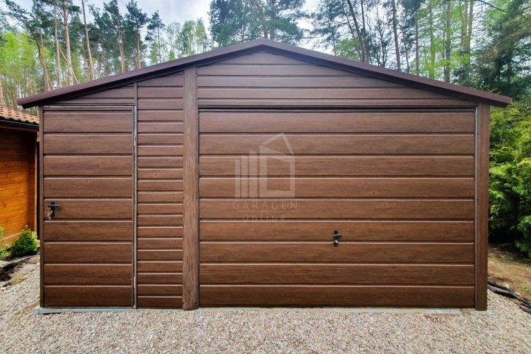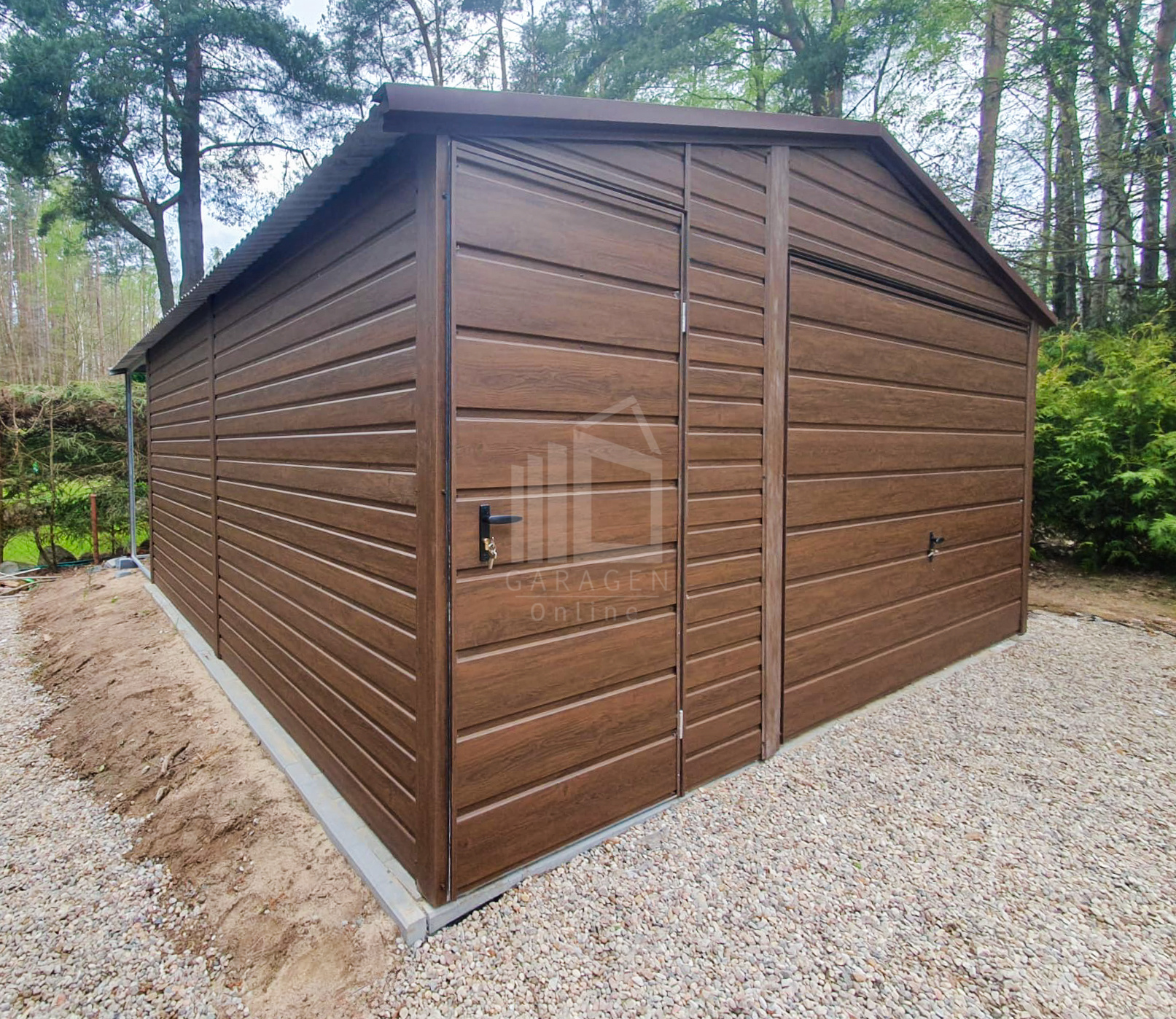 Blechgarage 4,5x6m + Überdachung 1,5m – Schwingtor – Tür – Dunkles Walnussholz – Holzoptik – Satteldach ID563