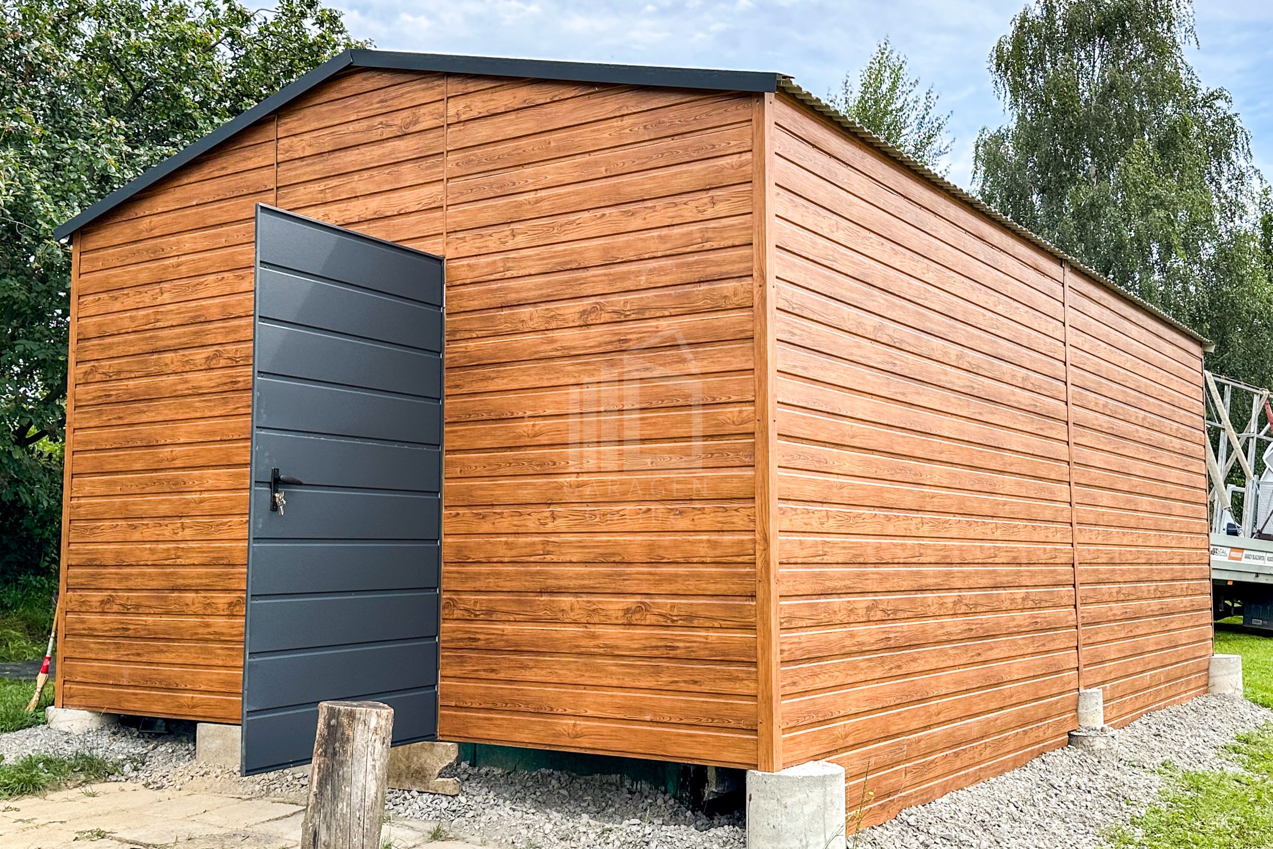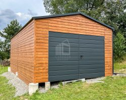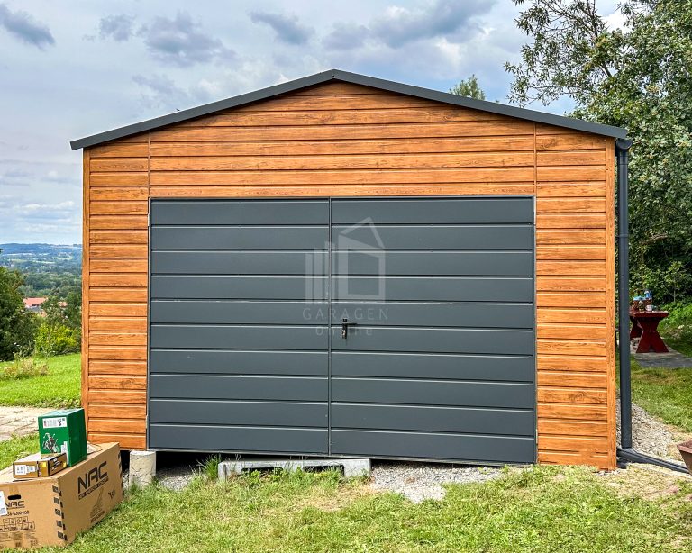 Blechgarage 4,5x6m – Zweiflügeliges Tor – Tür – Helles Walnussholz – Holzoptik – Dachrinnen – Satteldach ID664