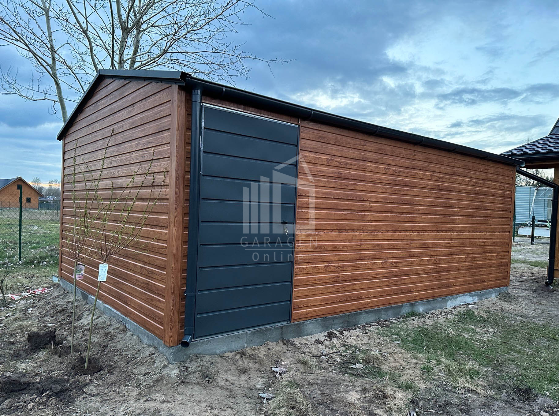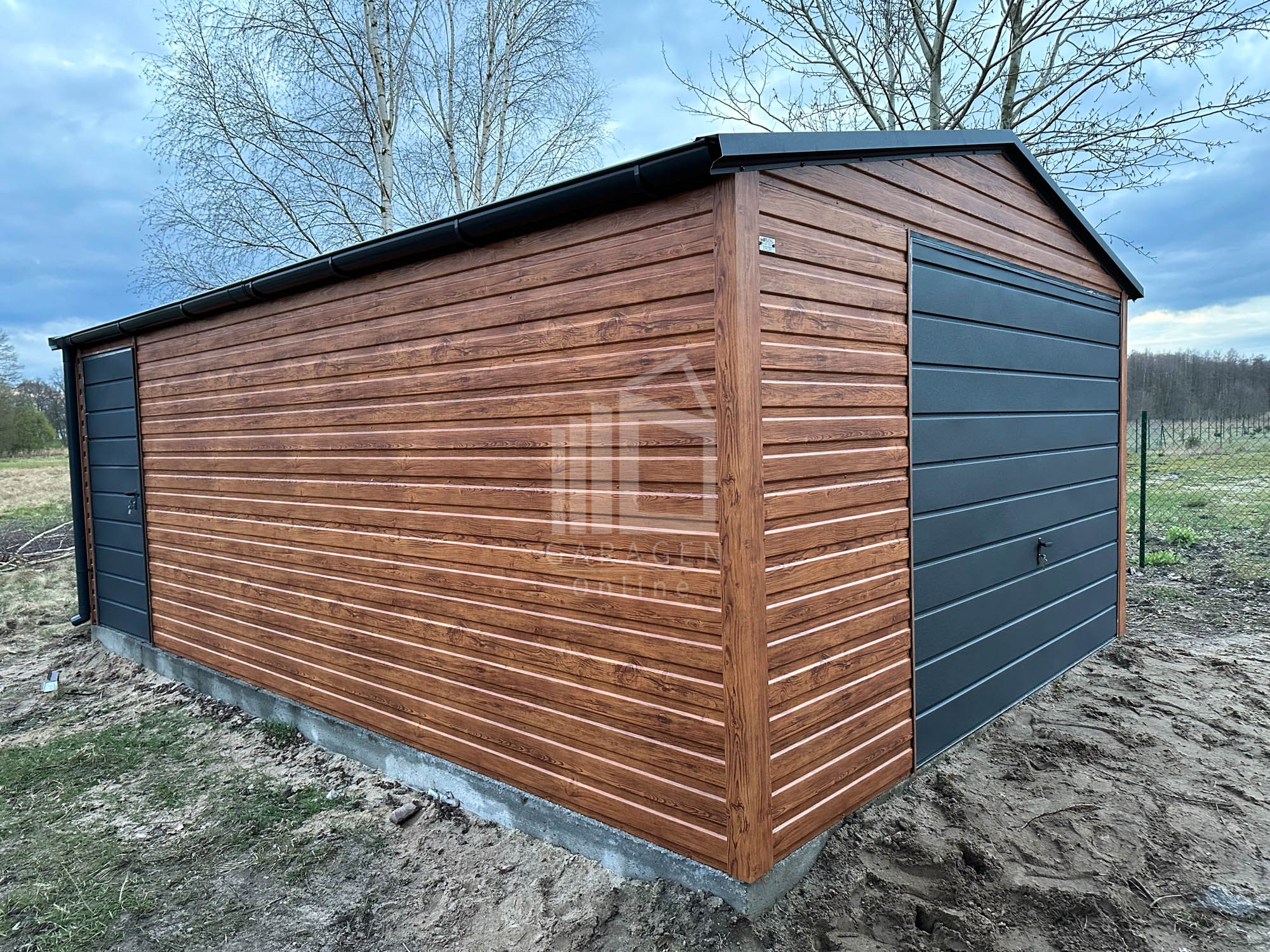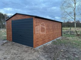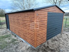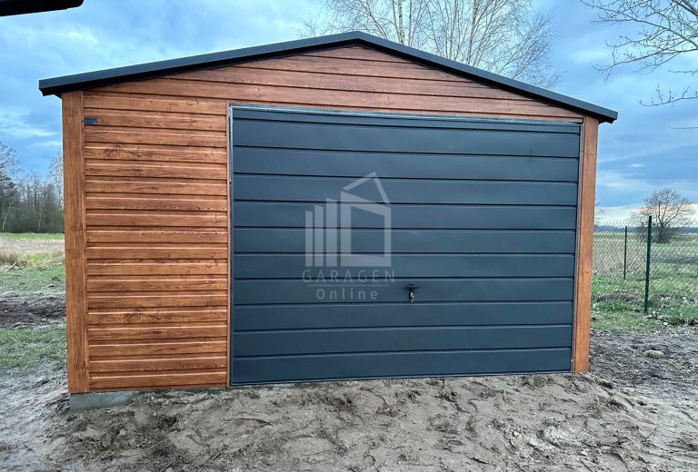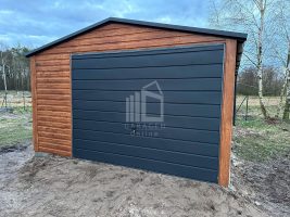 Blechgarage 4x6m Schwingtor – Tür – Dachrinnen – Helles Walnussholz – Holzoptik – Satteldach ID527