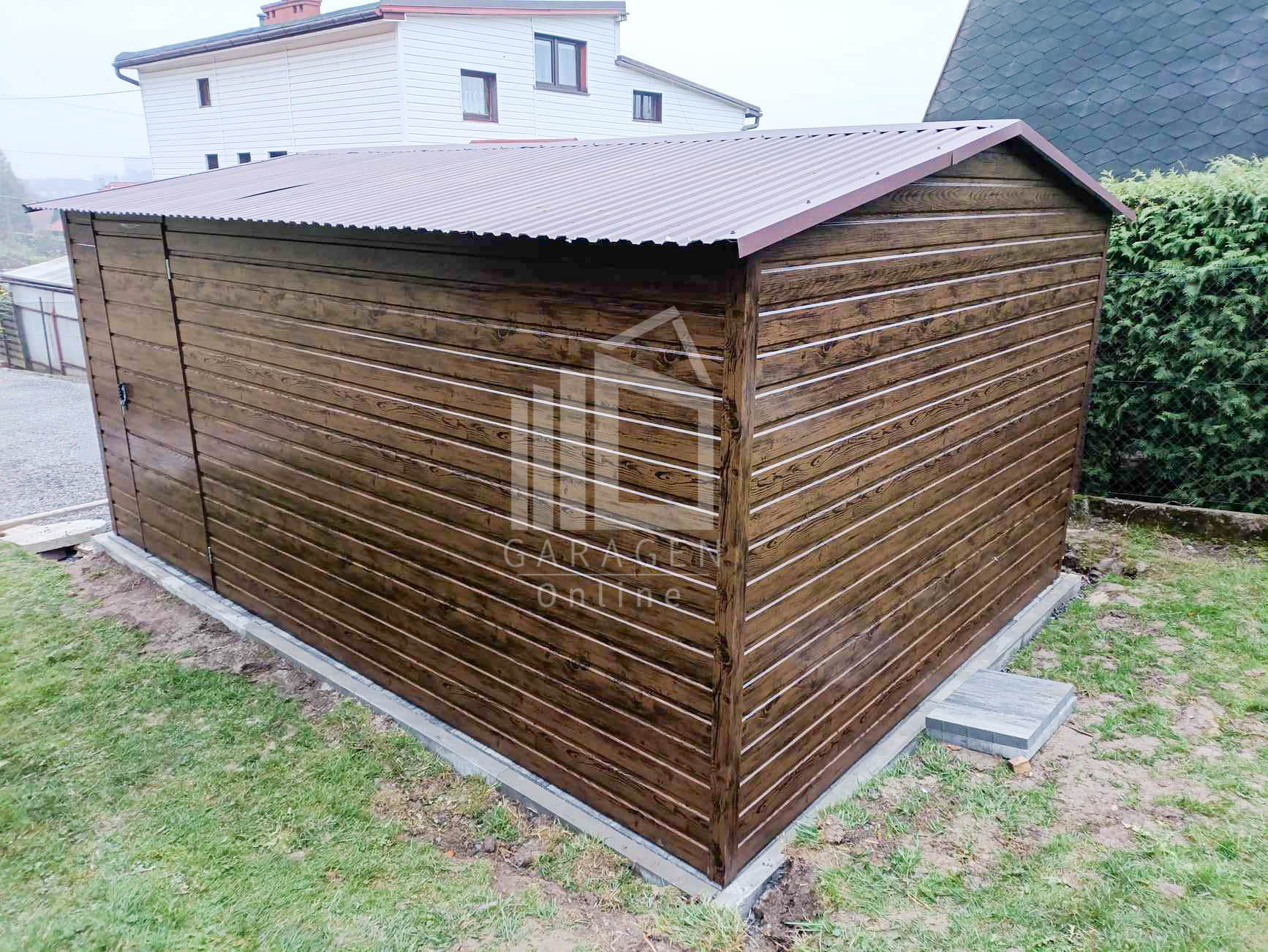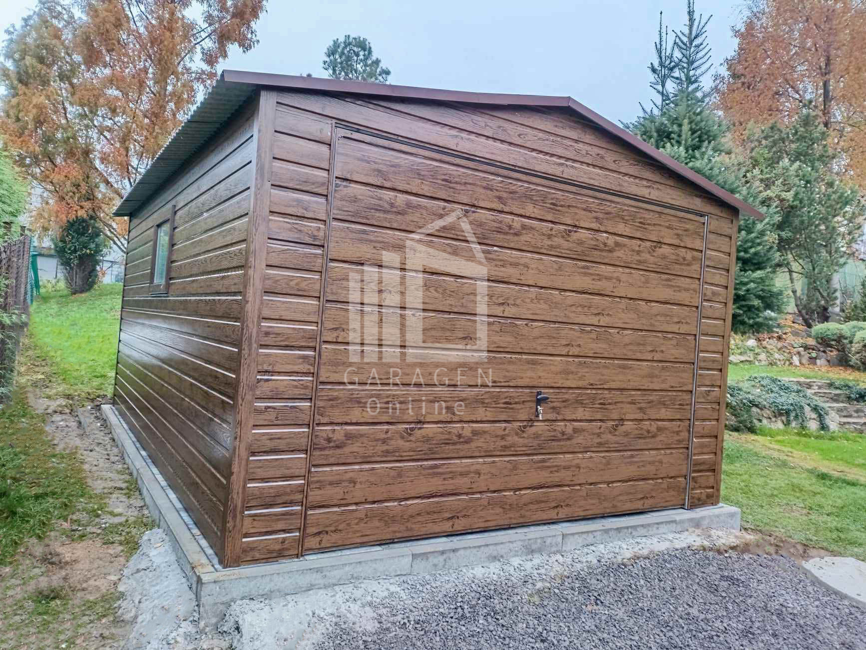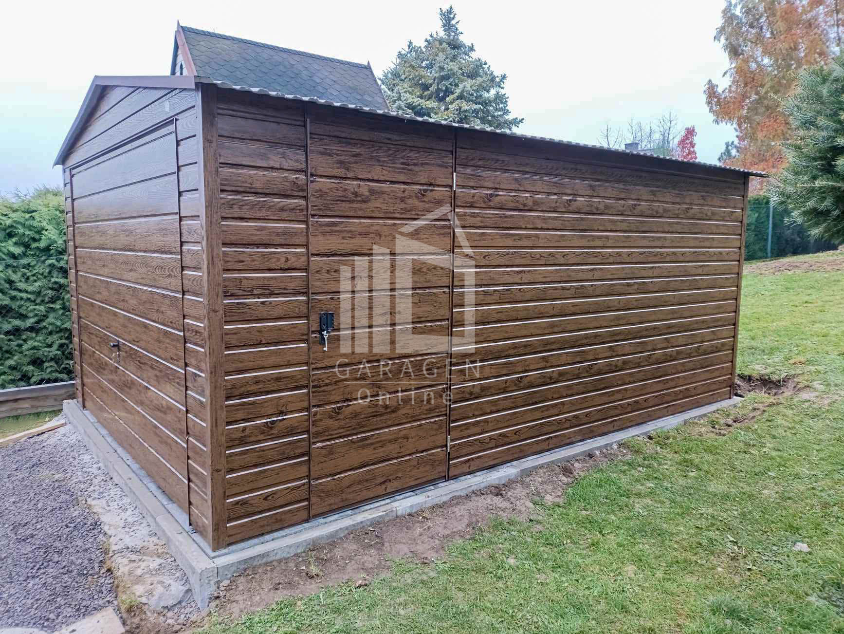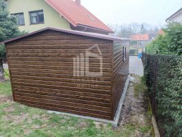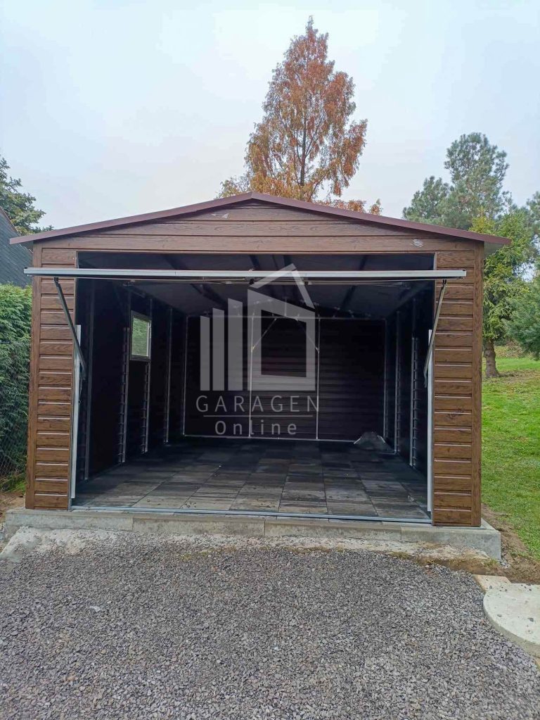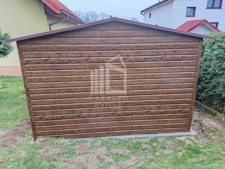 Blechgarage 4x6m Schwingtor – Tür – PVC Kippfenster – Holzoptik – Satteldach ID809