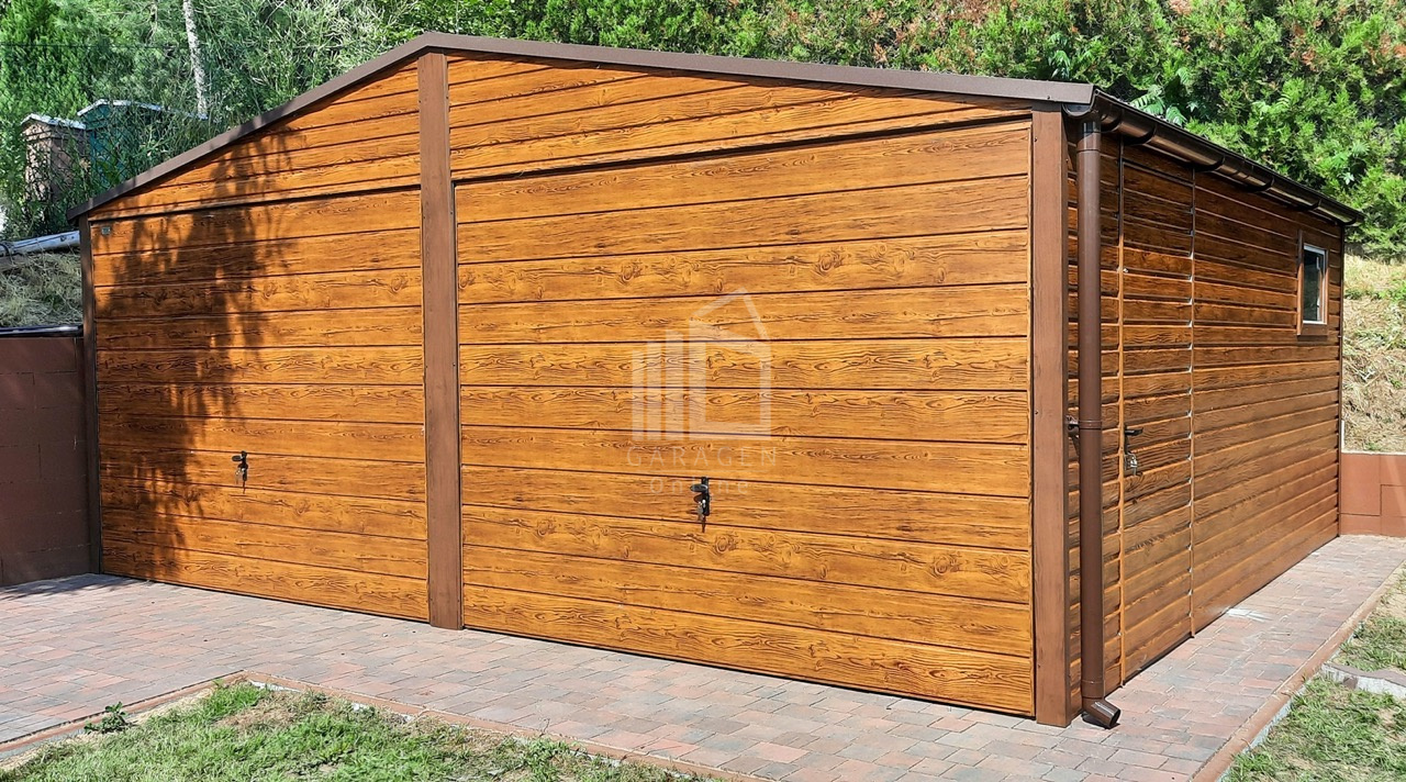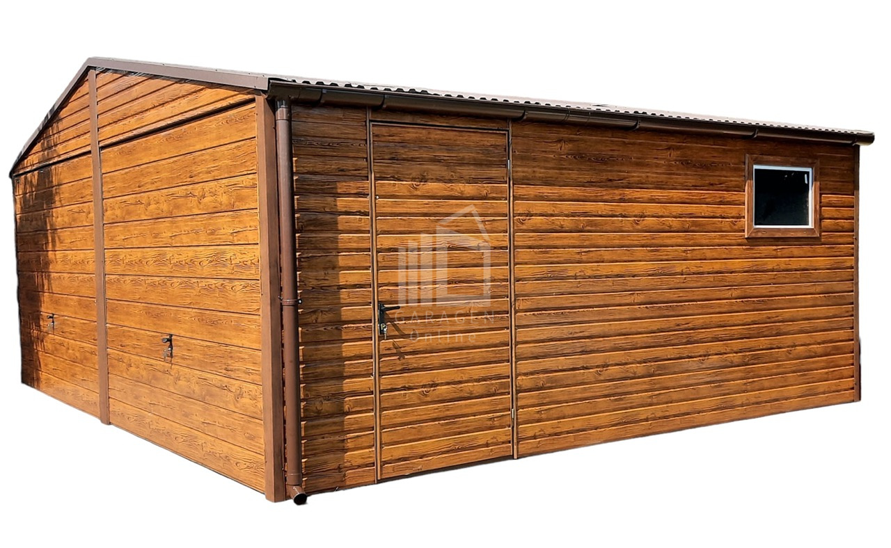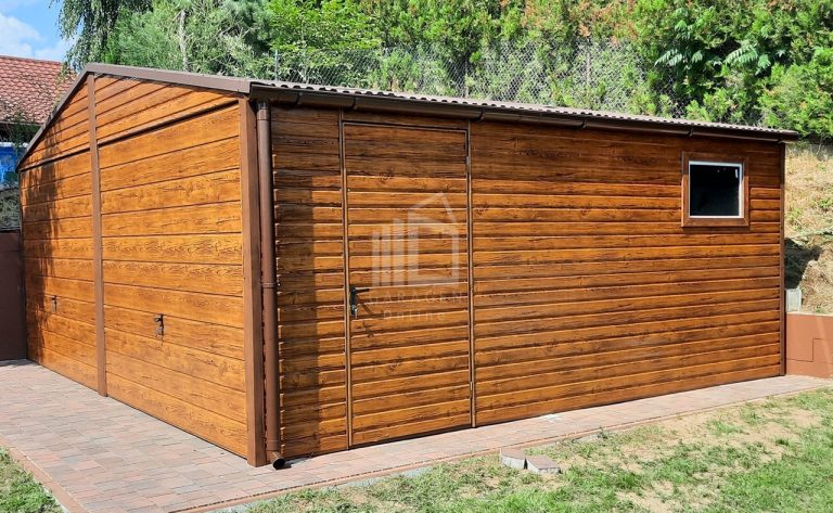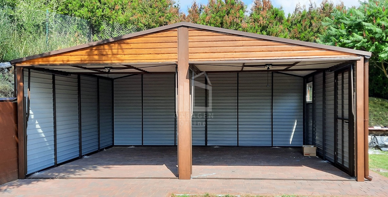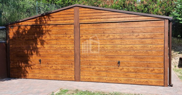 Blechgarage 6×5,8m Horizontal Blech 2x Schwingtor Satteldach Holzoptik ID113