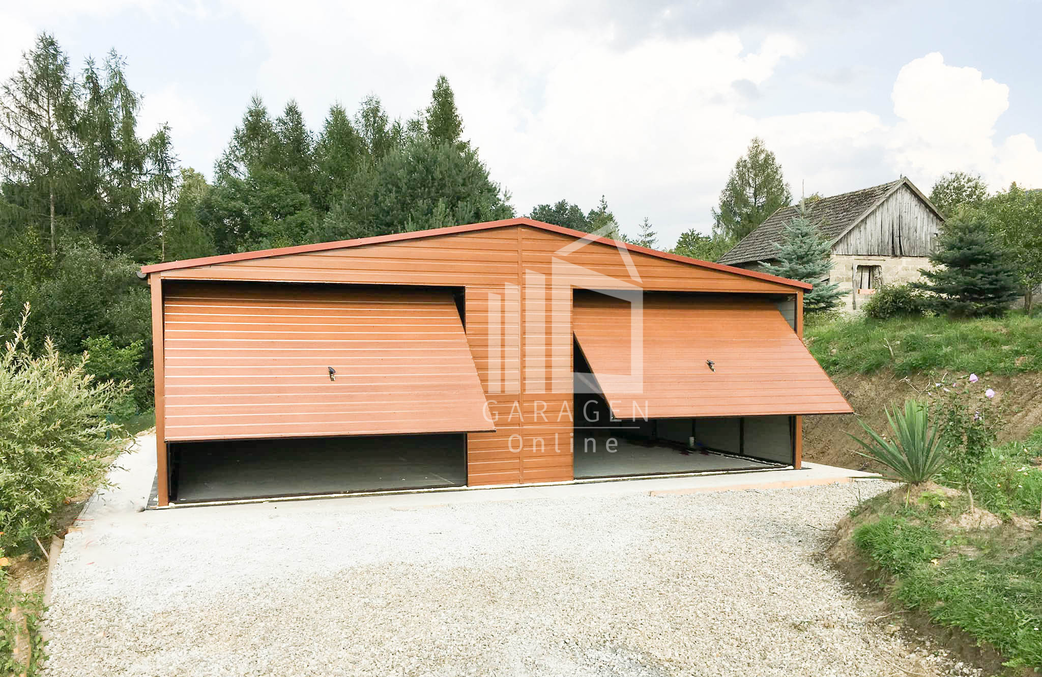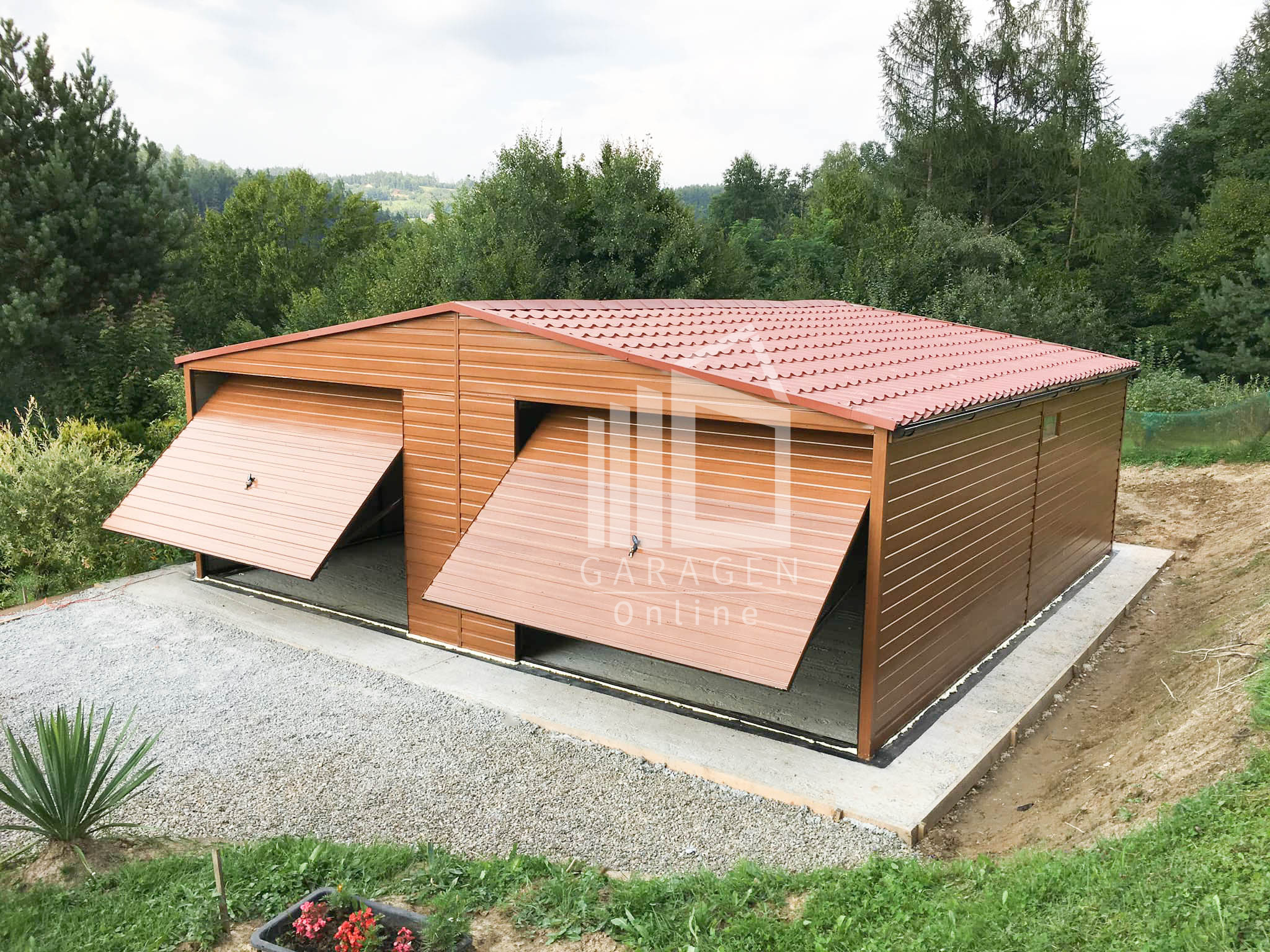 Blechgarage 7,5x6m – 2x Schwingtor – PVC Kippfenster – Holzoptik – Metalldachziegel – Dachrinnen – Satteldach ID795