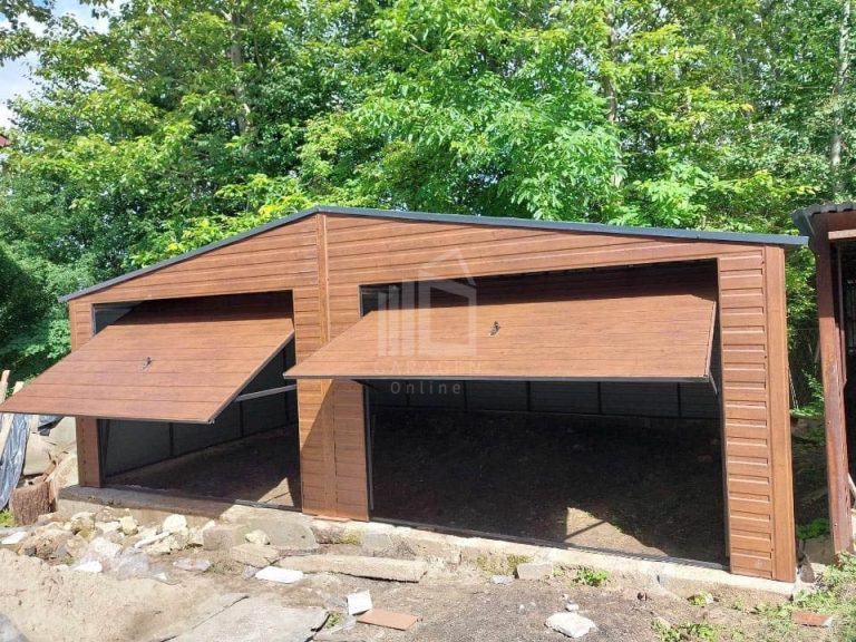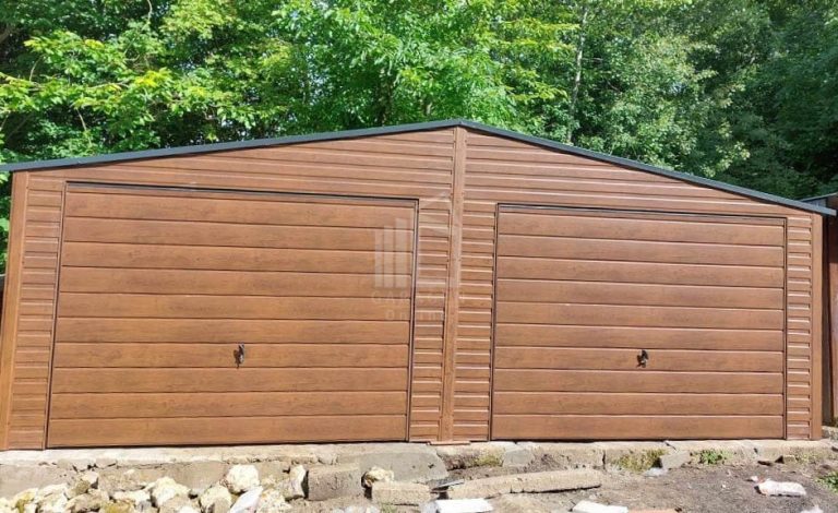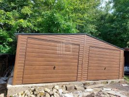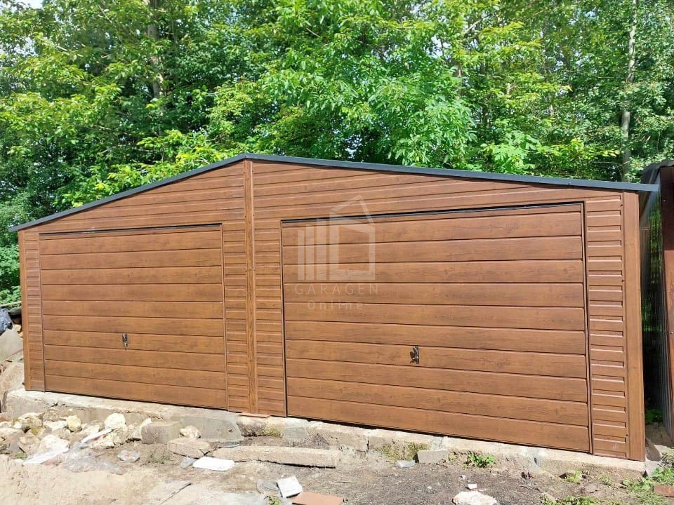 Blechgarage 7x5m-2x Schwingtor-HolzOptik-Helles Walnussholz-Satteldach GP203