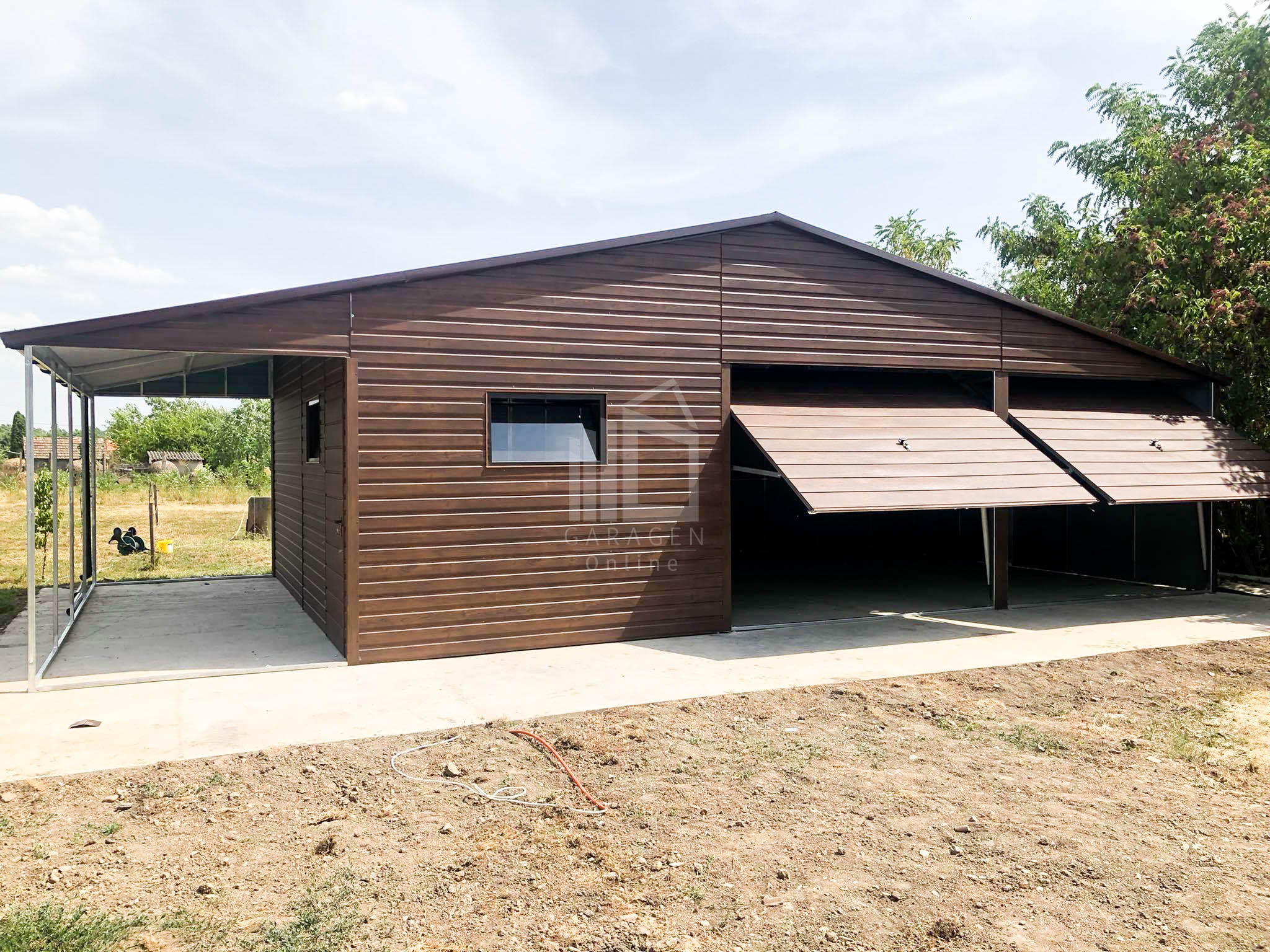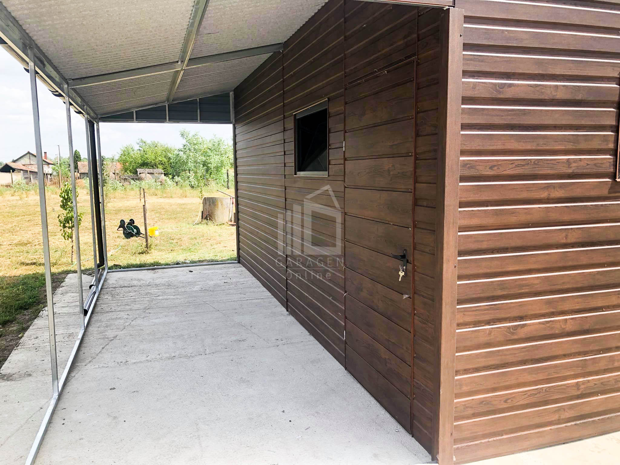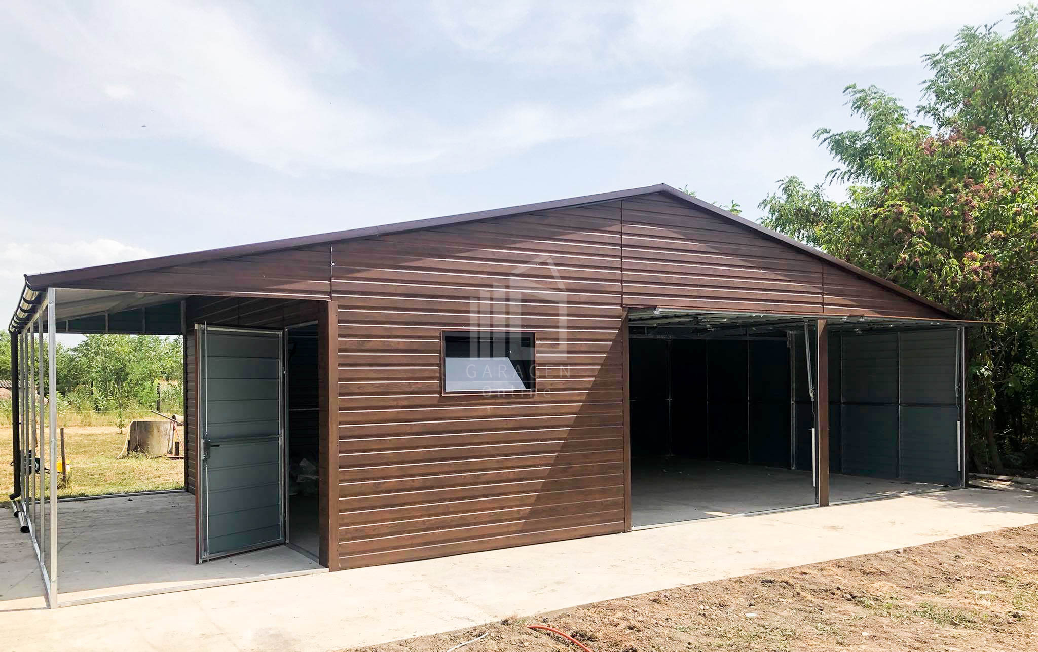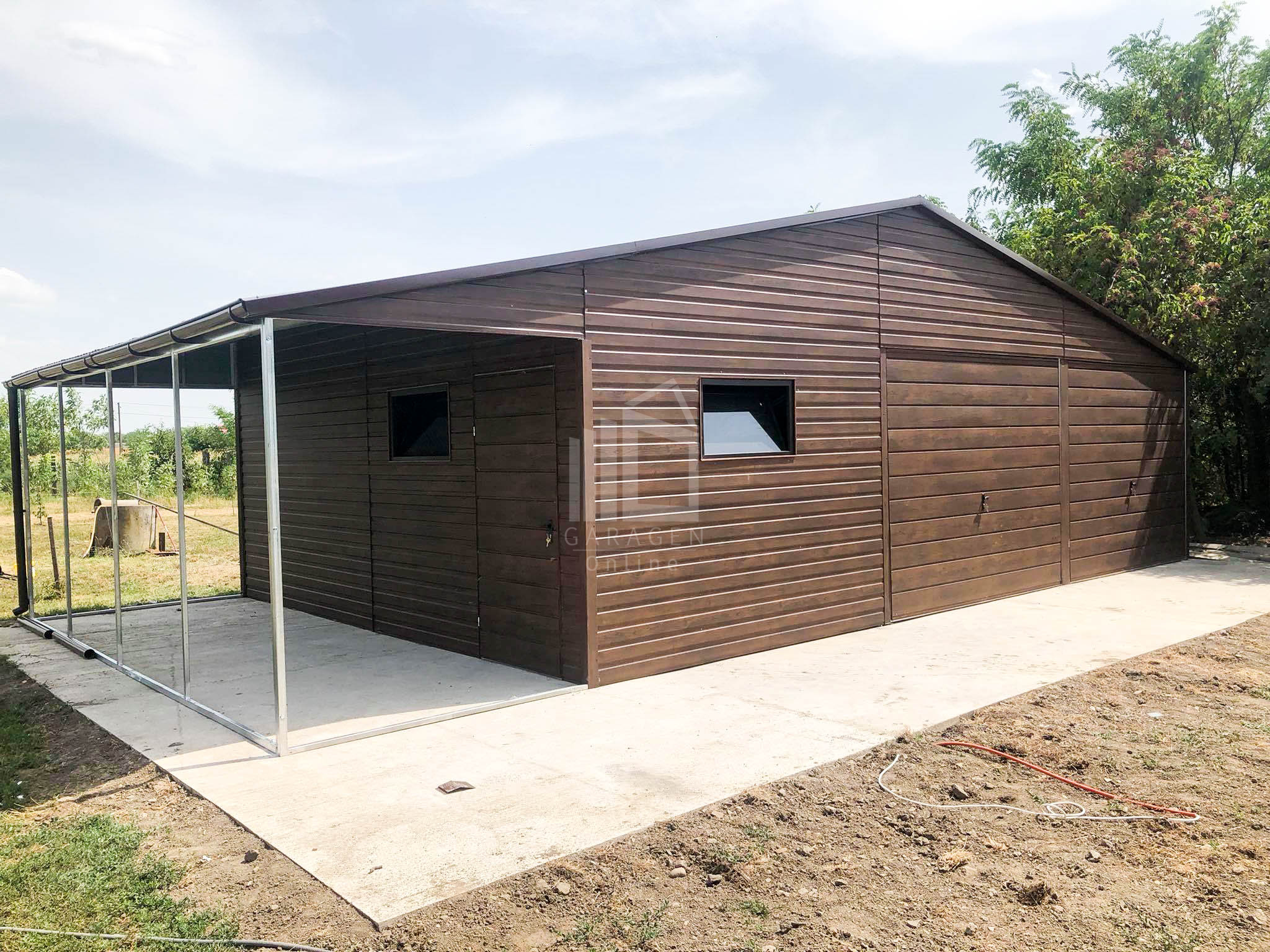 Blechgarage 9x6m + Überdachung 3m x 6m – Holzoptik – Satteldach GP135